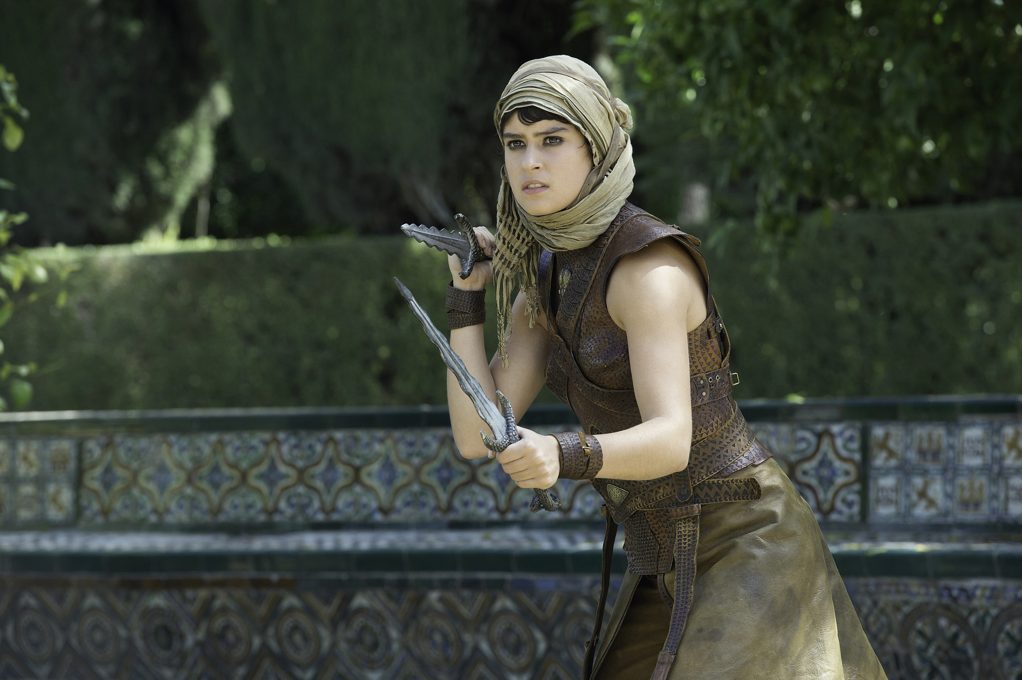 Description: A woman dressed in a costume holding a sword in her hand and looking at the camera with a serious look on her face.