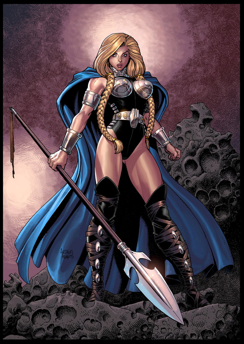 Description: A woman in a costume holding a sword and a spear in her hand.