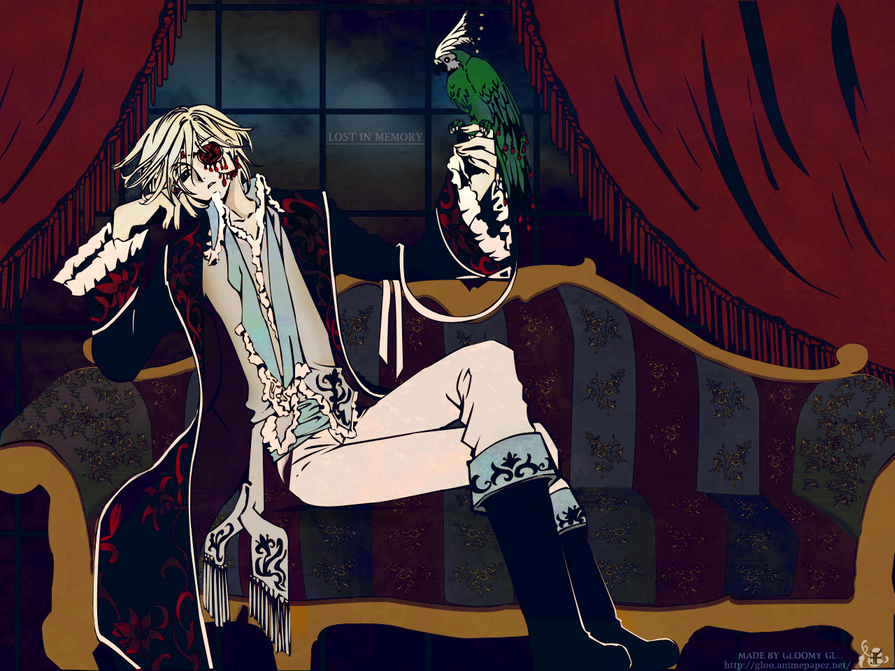 Description: A woman sitting on a couch with a bird in her hand and a bird in her hand on her leg.