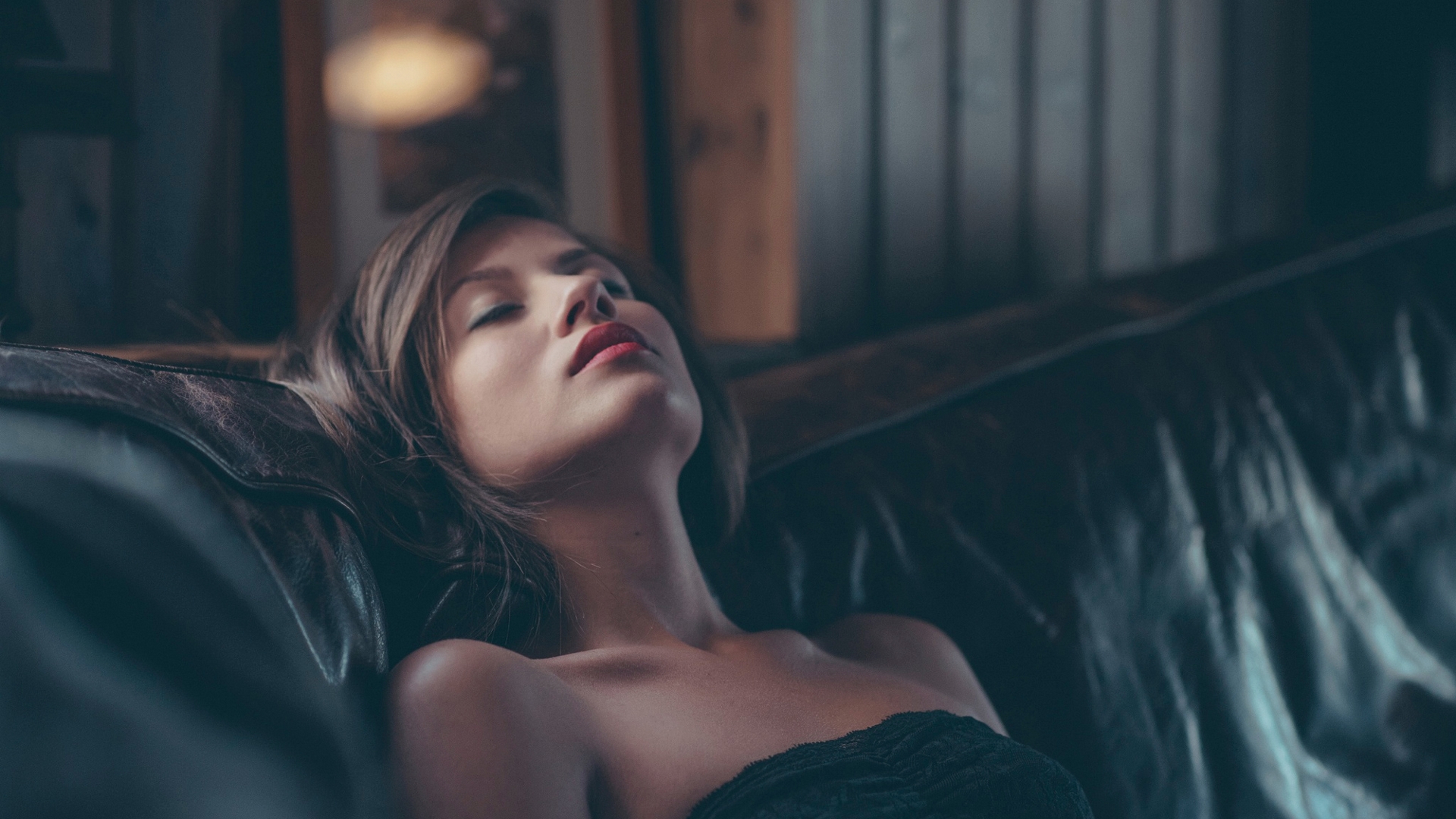 Description: A woman laying on a couch with her eyes closed and her head tilted back to the side of the couch.
