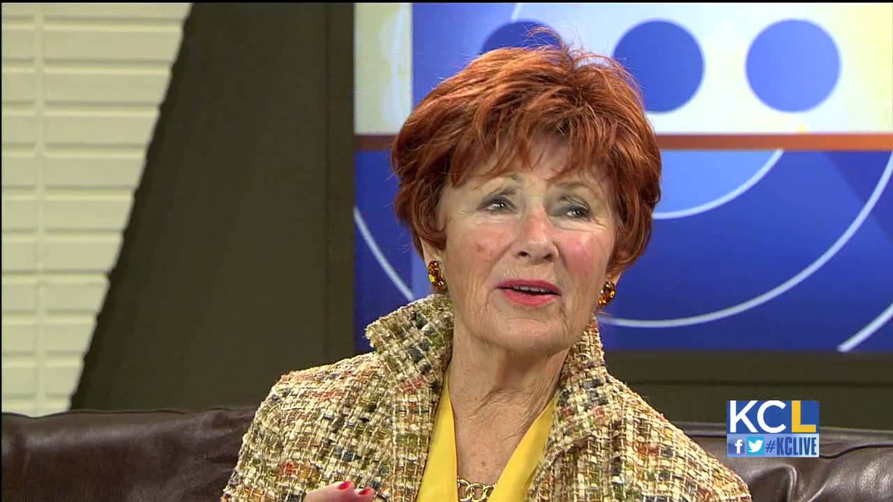 Description: A woman sitting on a couch talking to someone on the television screen behind her is a news anchor with a news anchor.