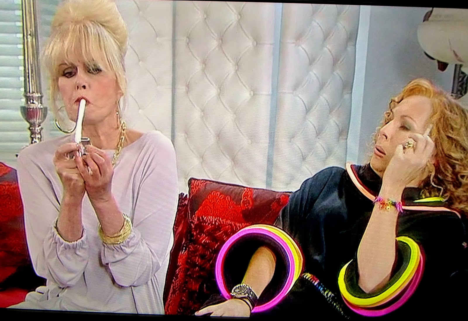 Description: A woman is sitting on a couch with a toothbrush in her mouth and another woman is holding a cell phone.
