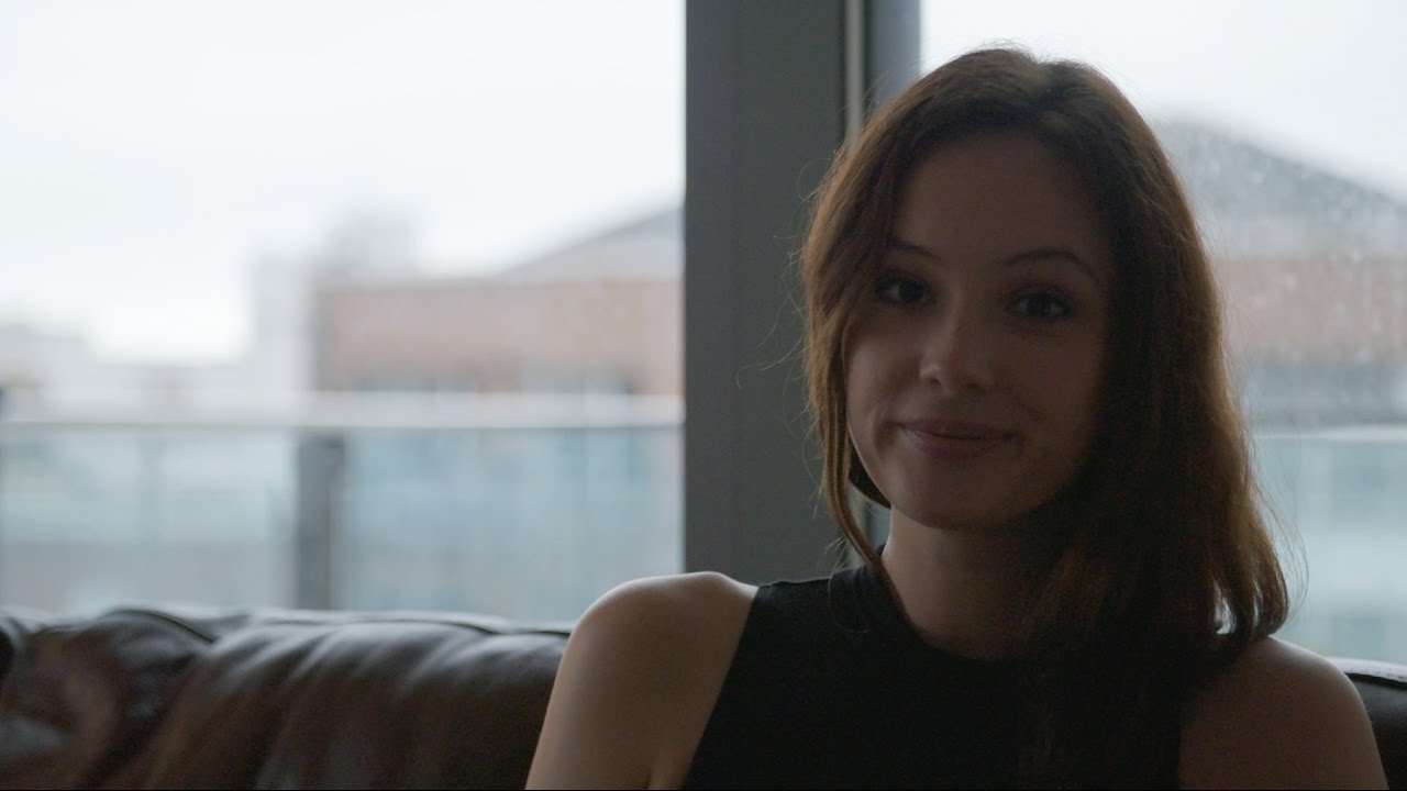 Description: A woman sitting on a couch in front of a window with rain coming down on her head and hair.