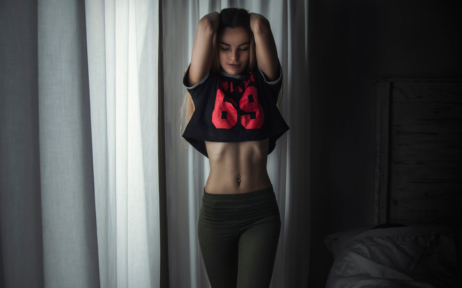 Description: A woman in tight pants and a crop top is standing in front of a window with her hands on her head.