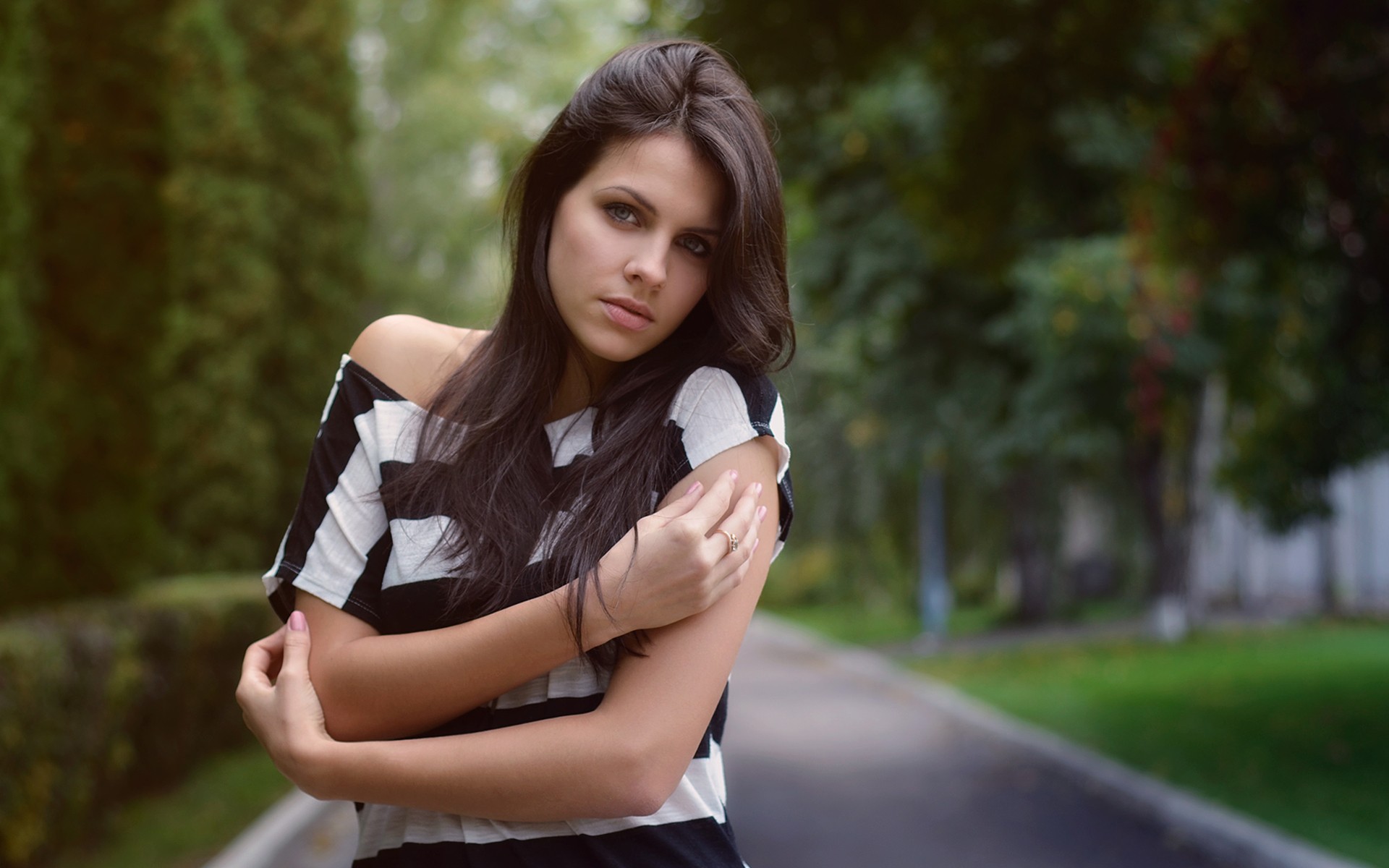 Description: A woman standing on a street with her arms crossed and her arms crossed over her chest.