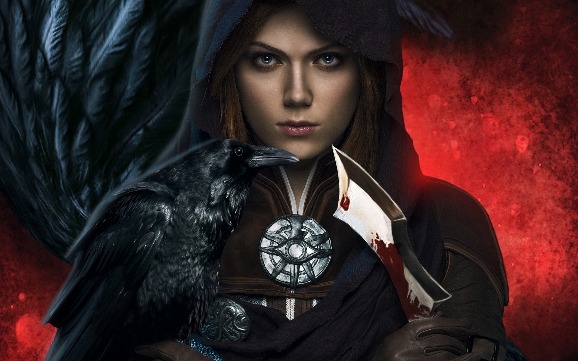 Description: A woman with a crow on her shoulder and a knife in her hand.