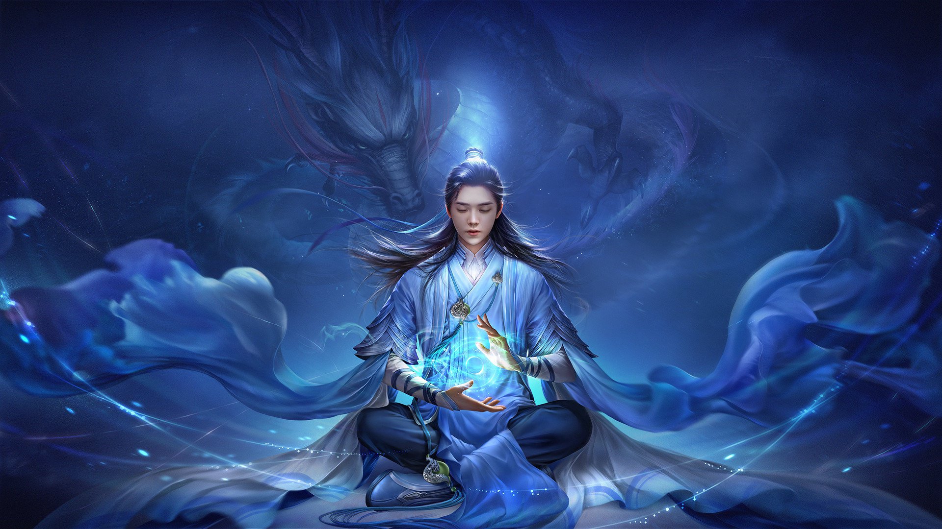 Description: A woman sitting in a lotus position with a crystal ball in her hands and a dragon in the background.