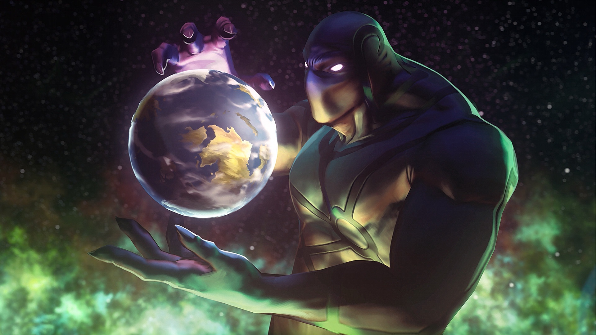 Description: A woman holding a crystal ball in her hands with a green background and stars in the sky behind her.