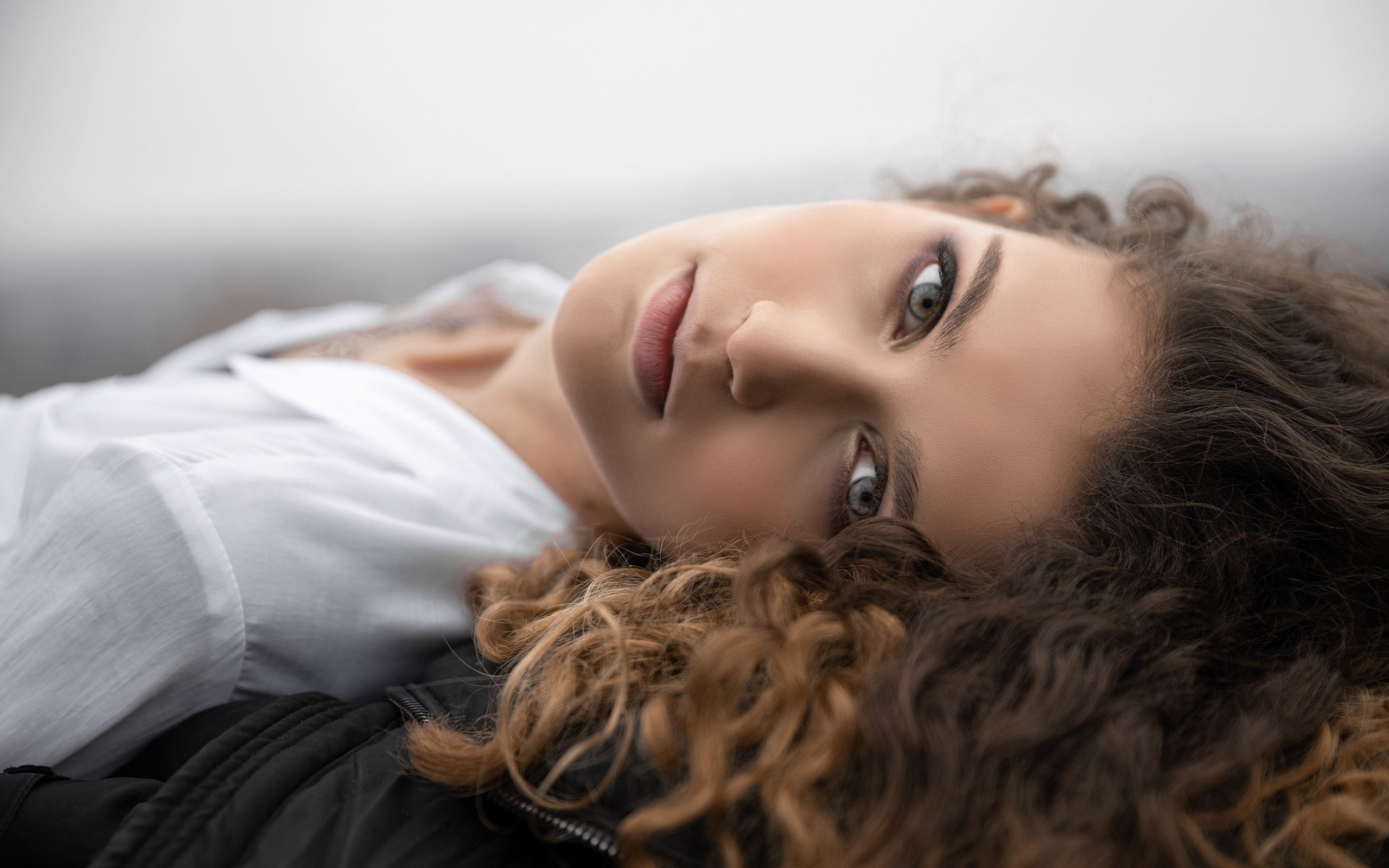 Description: A woman with curly hair laying down on a couch looking at the camera with a smile on her face.