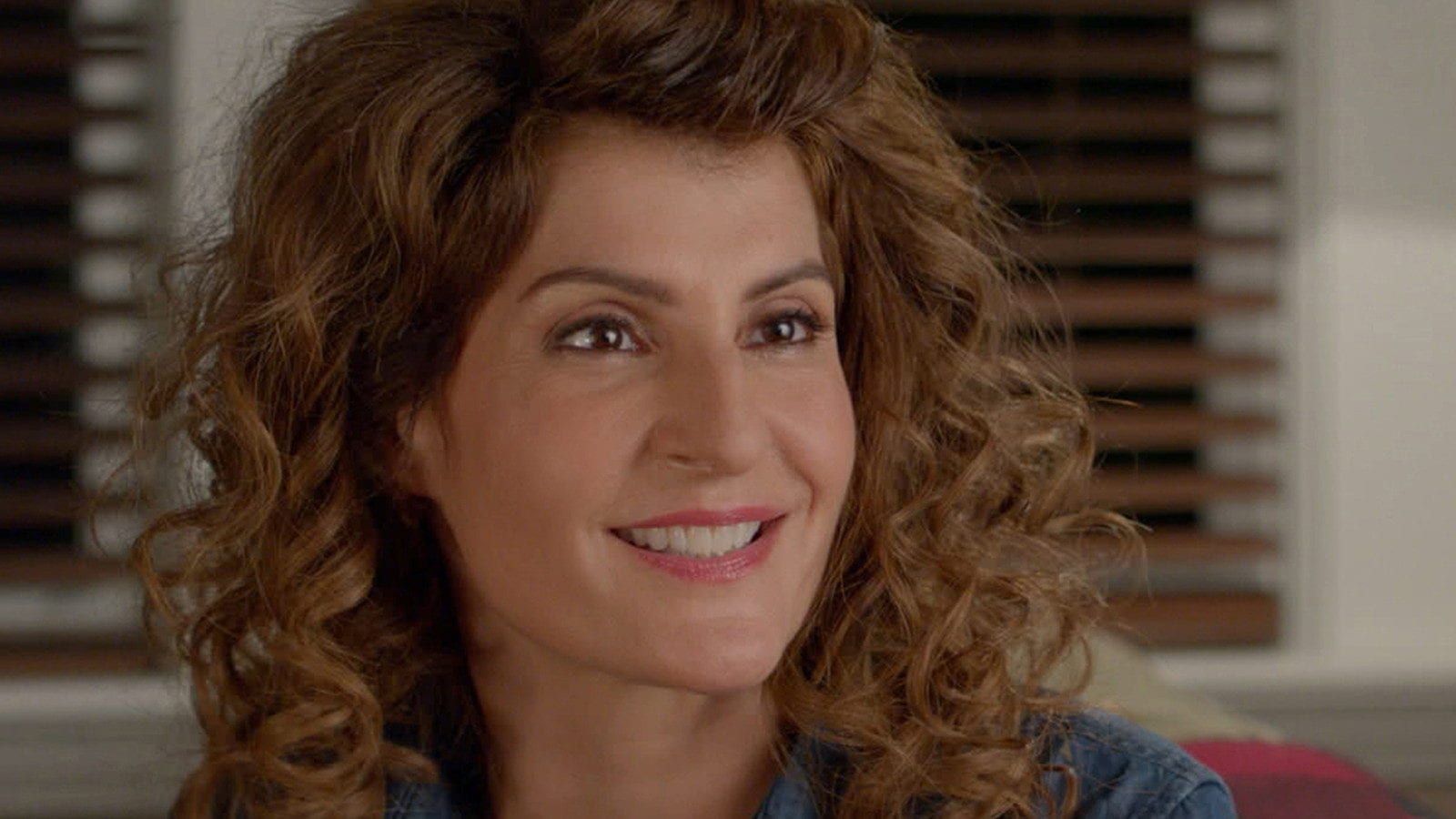 Description: A woman with curly hair and a blue shirt smiling at the camera with a window in the background and blinds in the background.