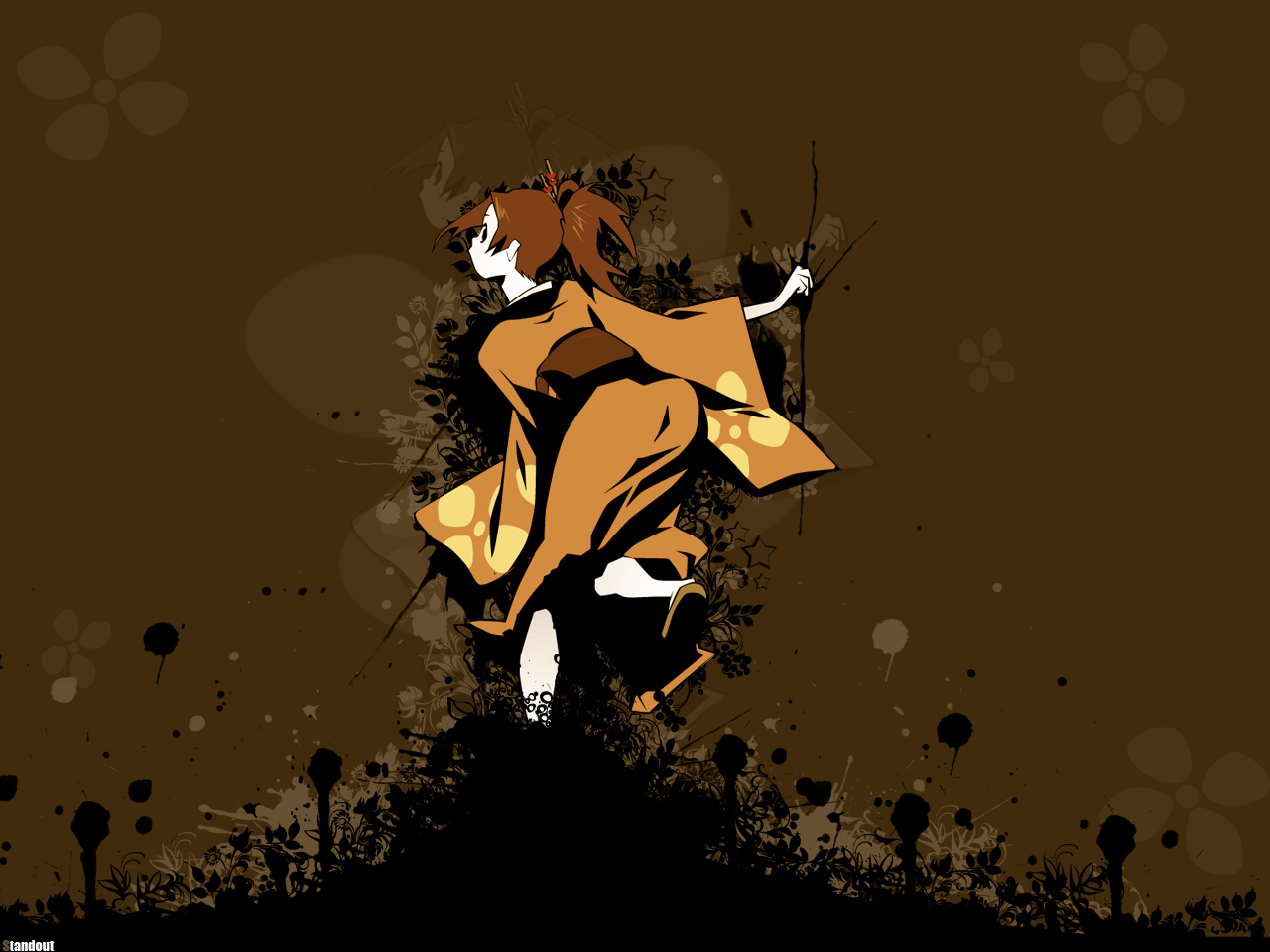 Description: A woman dancing on a brown background with a dog on her back and a black and white dog on her arm.