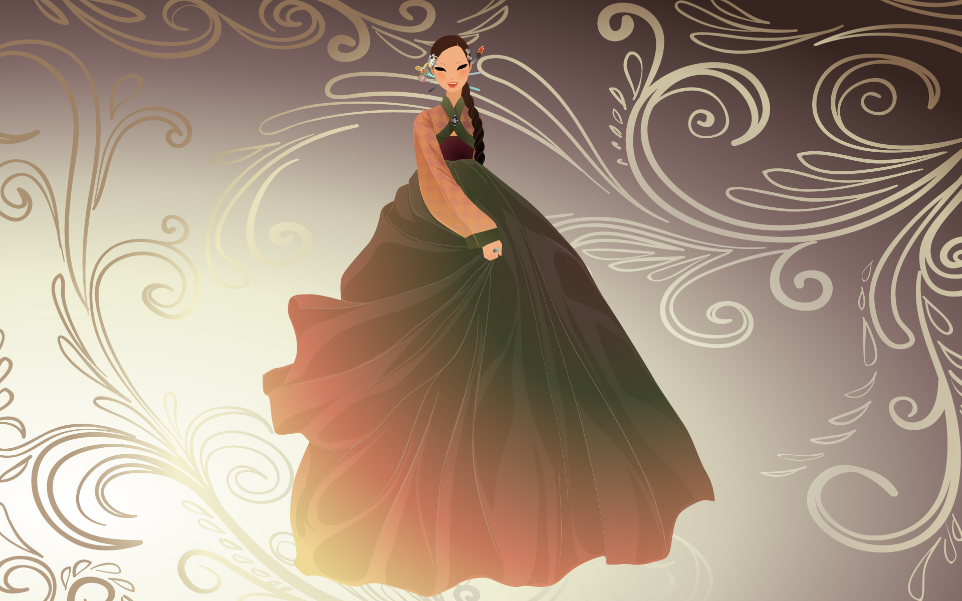 Description: A woman in a long dress is dancing with a floral background behind her and a swirly design on the wall.