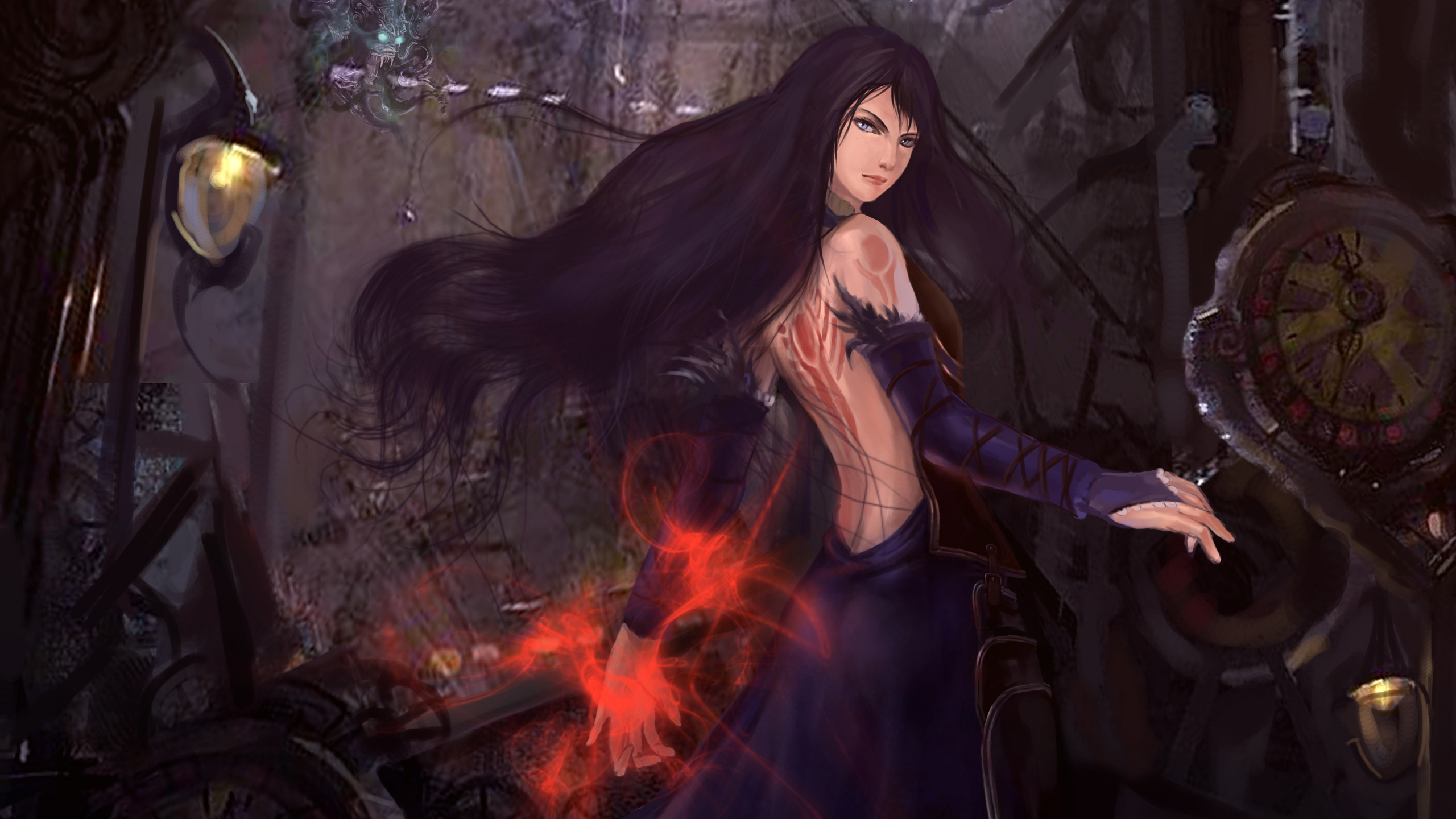 Description: A woman in a dark dress standing in a room with a clock on the wall and a clock on the wall.