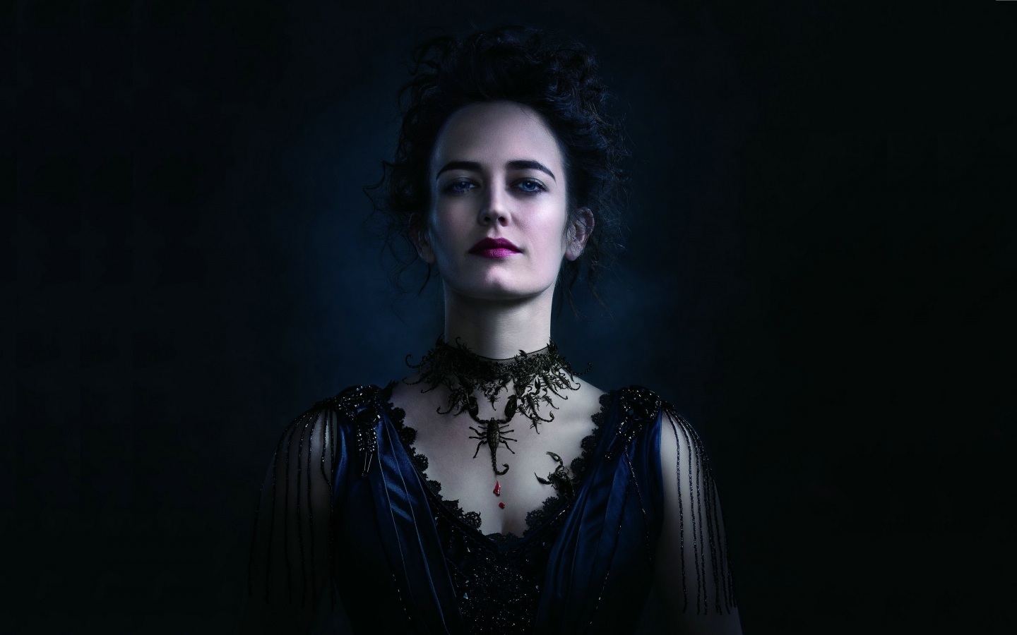 Description: A woman in a dark dress with a spider on her neck and a spider on her collar.