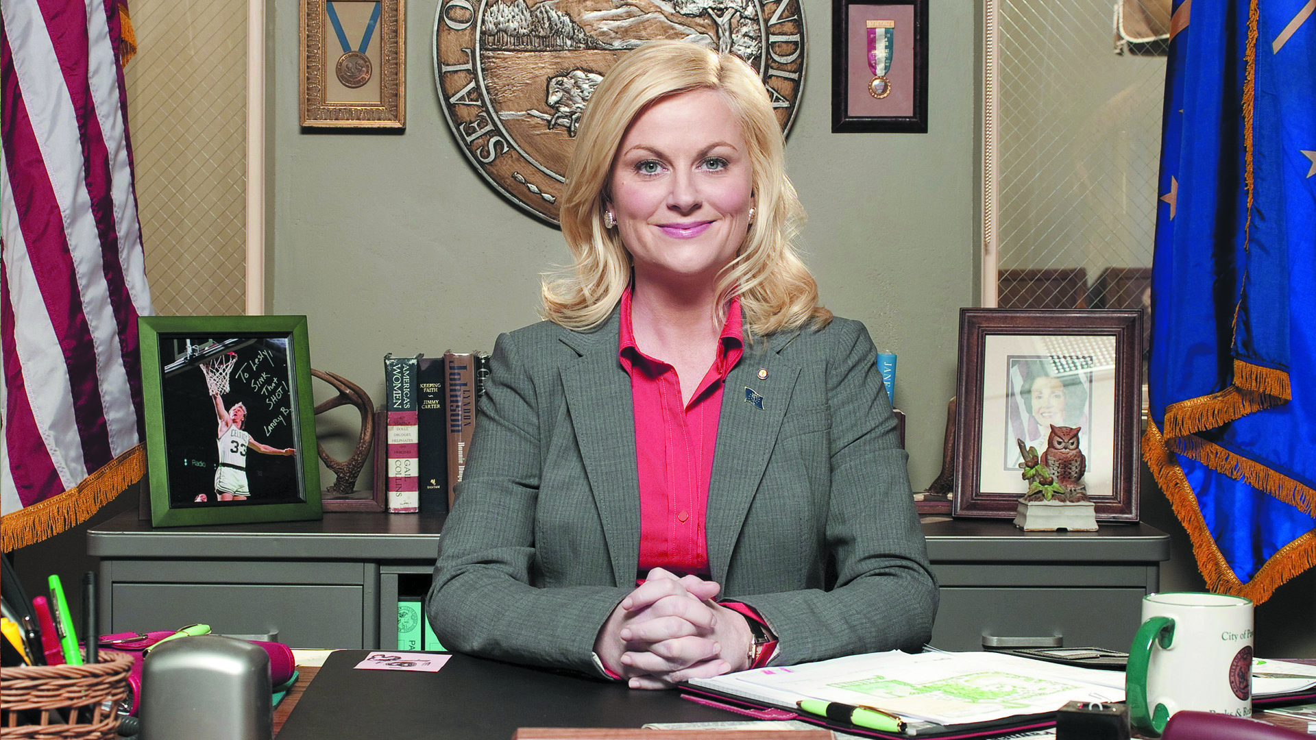 Description: A woman sitting at a desk with a book and pen in her hand and a flag behind her.