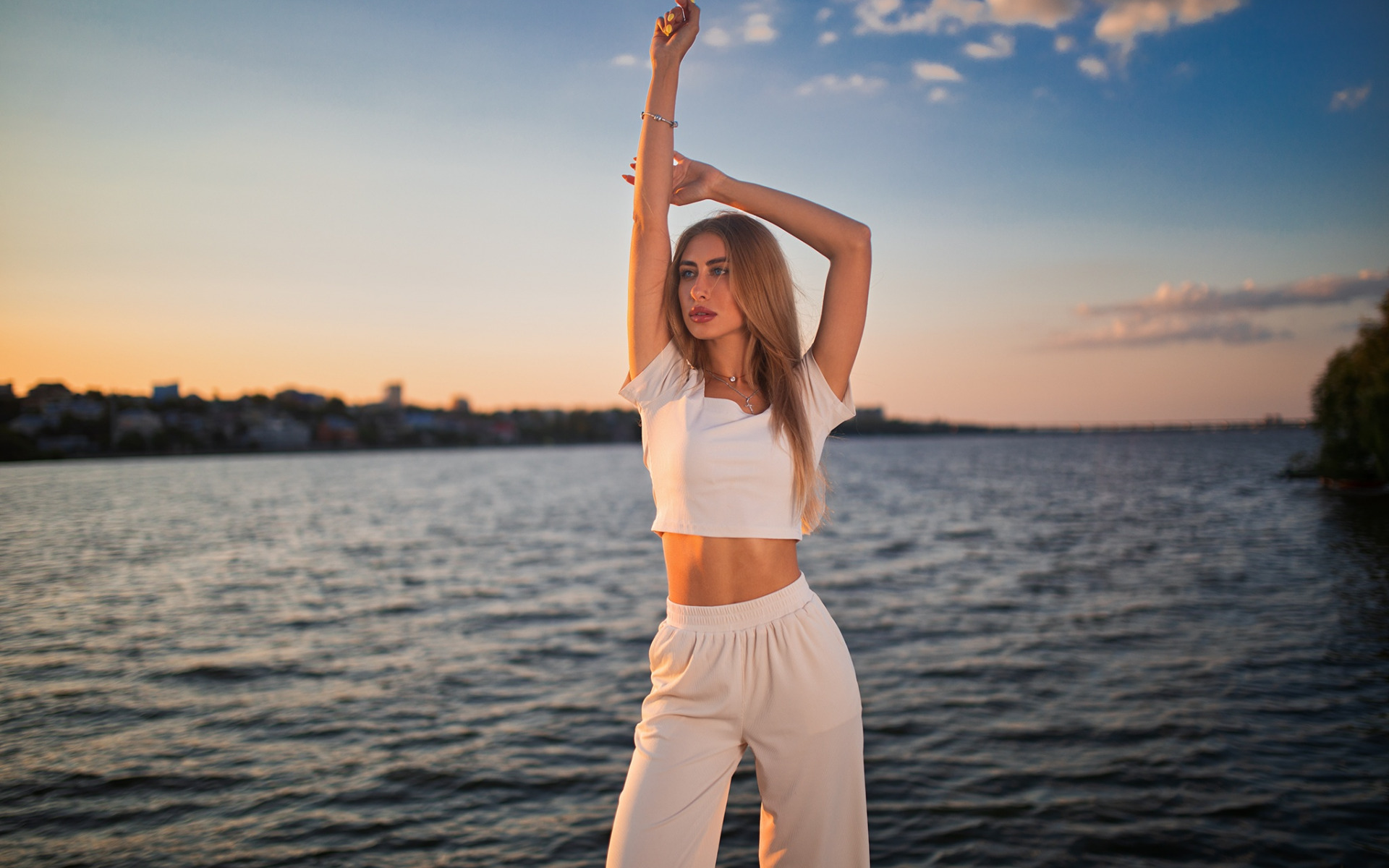 Description: A woman standing on a dock with her arms up in the air and her hands in the air above her head.