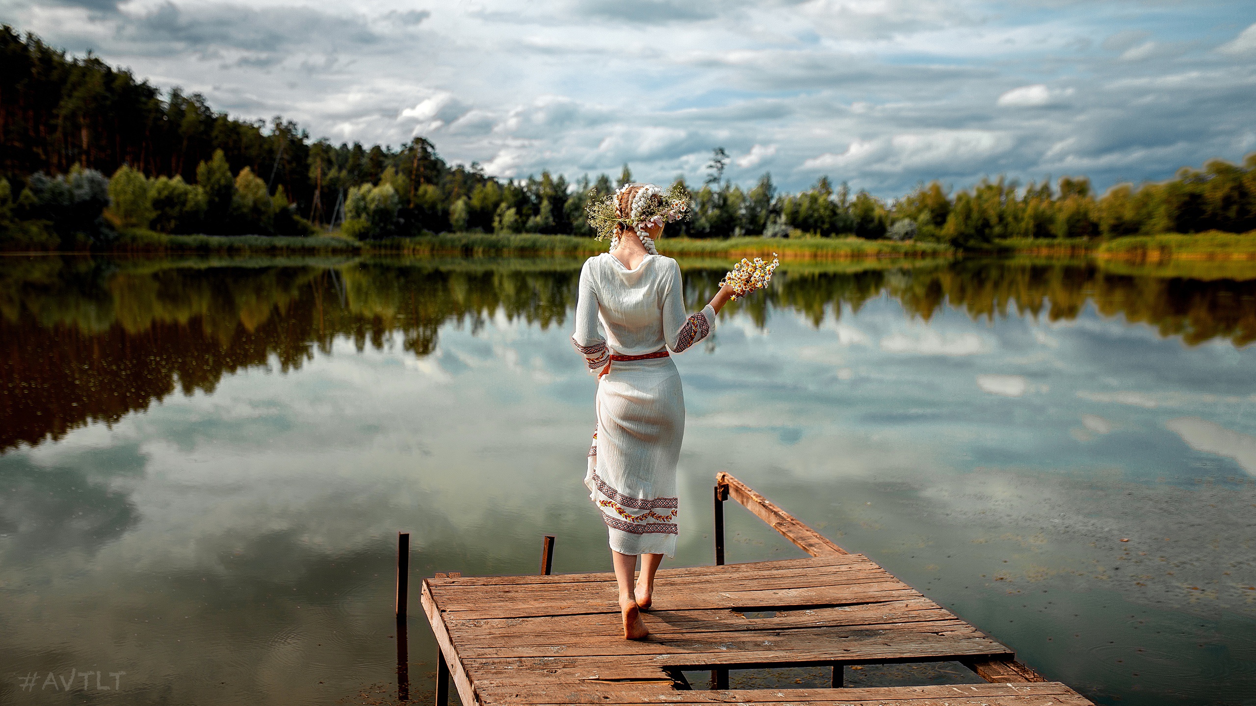Description: A woman standing on a dock holding a piece of bread in her hand and looking at the water with a cloudy sky in the background.