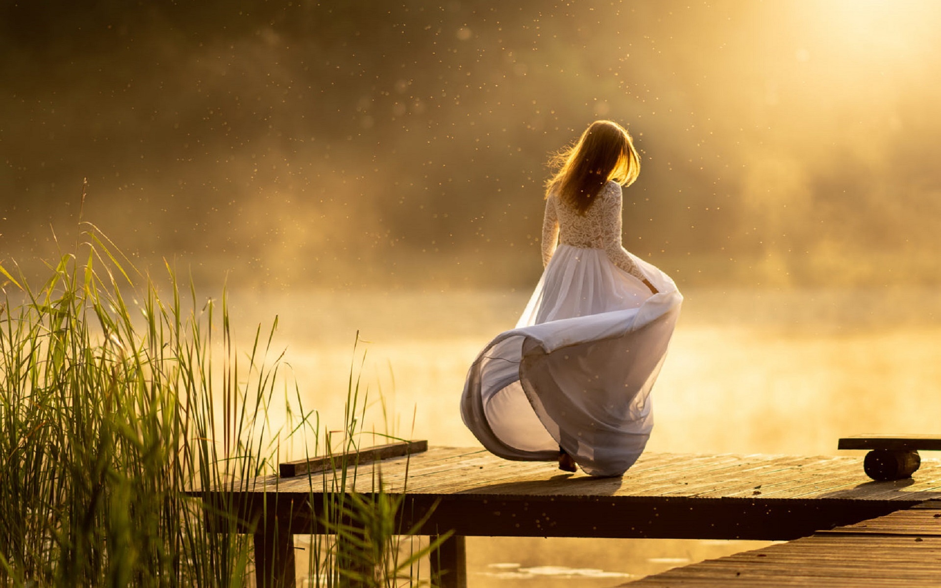 Description: A woman sitting on a dock looking at the water and grass in the background with the sun shining through the fog.