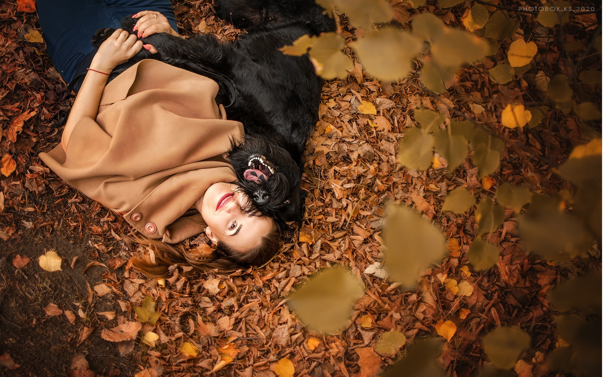 Description: A woman laying on the ground with a dog in her lap and leaves all around her.