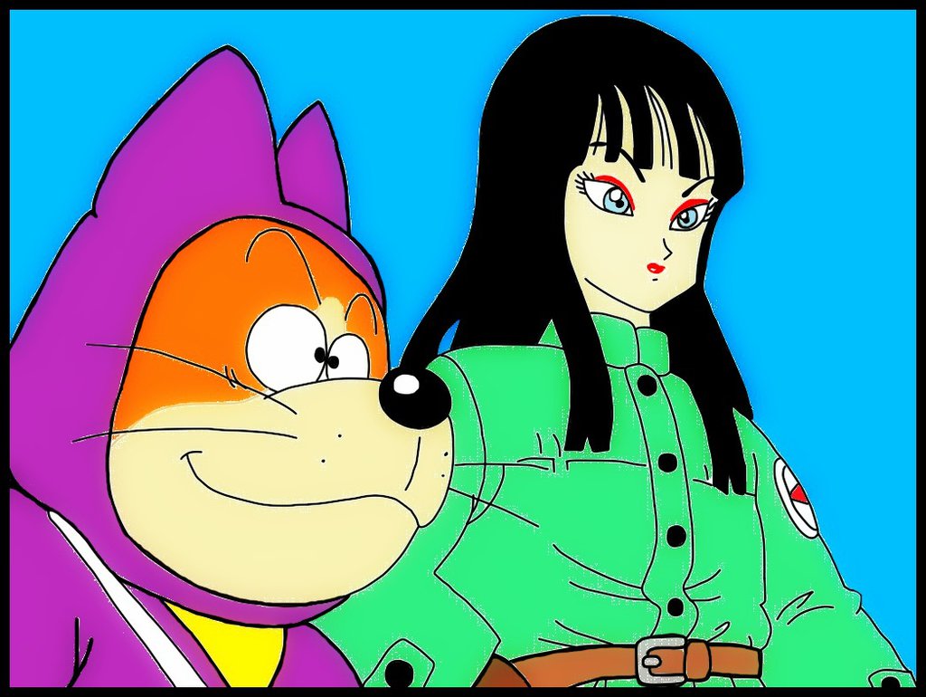 Description: A woman with a dog in her lap and a cartoon dog in her lap.