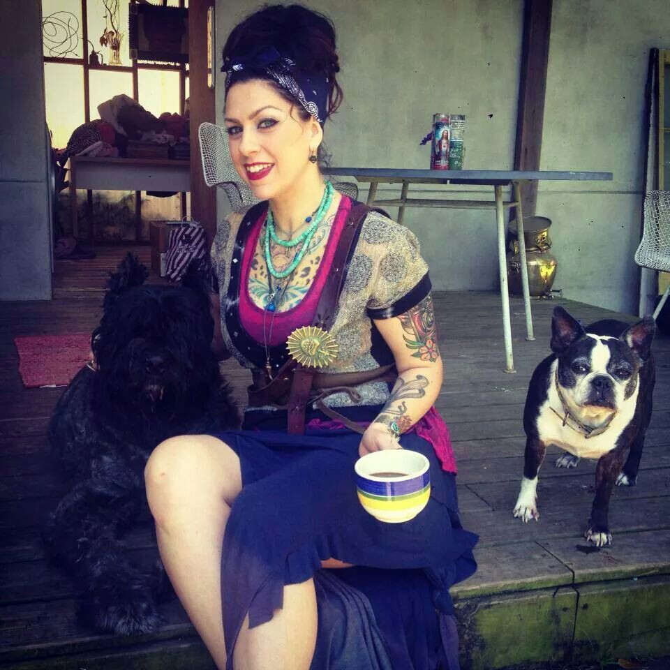 Description: A woman sitting on a step with a dog and a cup of coffee in her hand and a dog standing next to her.