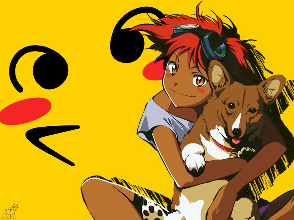 Description: A woman holding a dog in her arms with a yellow background behind her and a black and white dog in her lap.