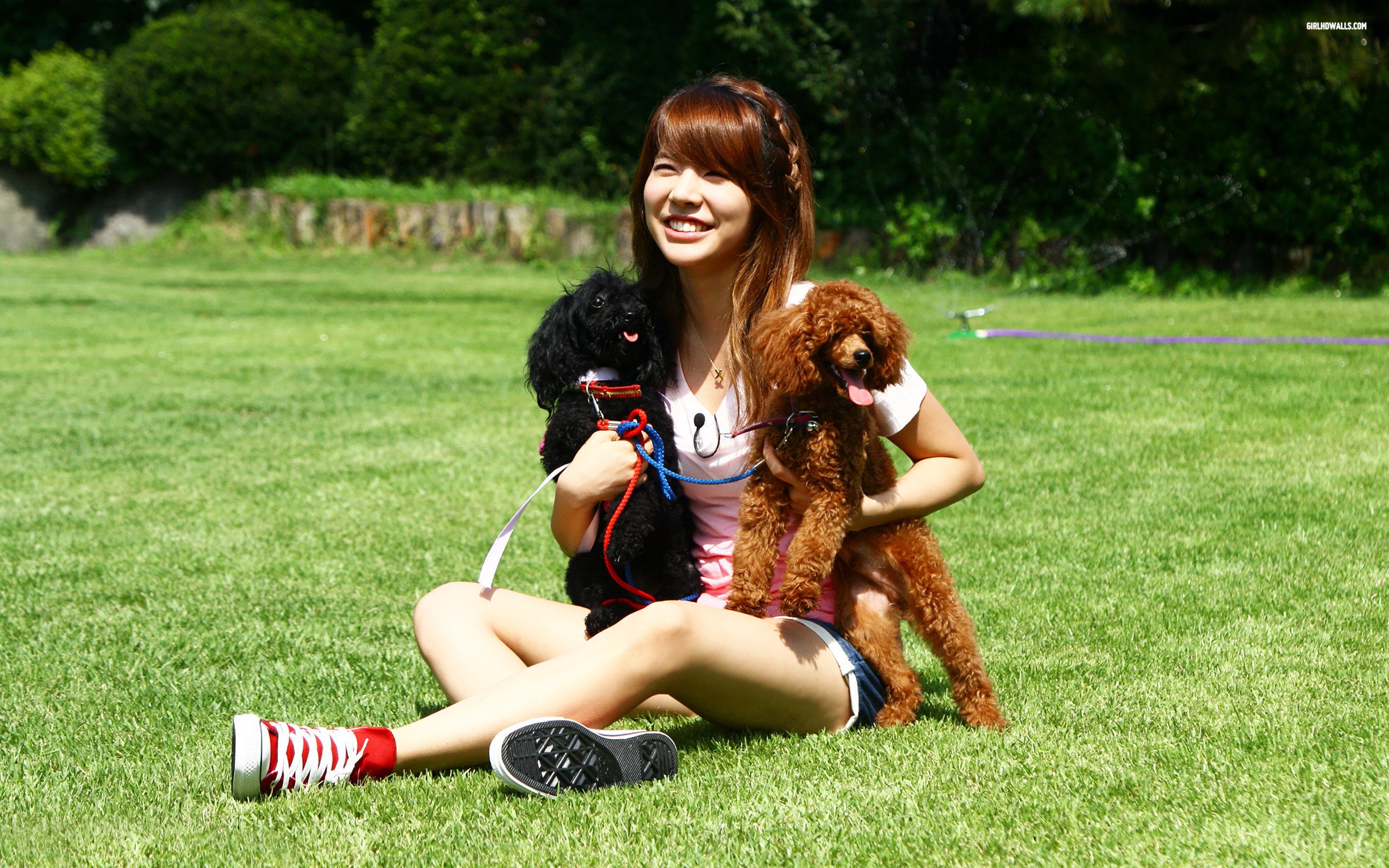 Description: A woman sitting on the grass with two dogs and a cell phone in her hand and a camera in her other hand.