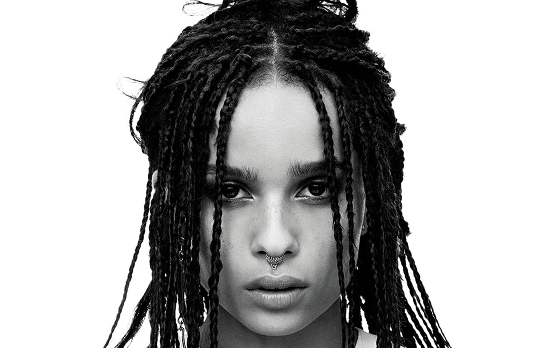 Description: A woman with dreadlocks on her head and a white background is shown in black and white photo.