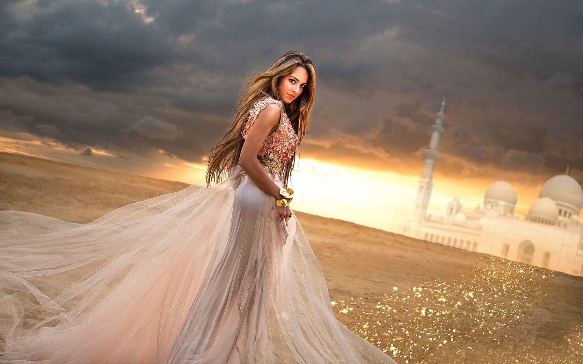 Description: A woman in a dress standing in front of a building with a sky background and a sunset behind her.