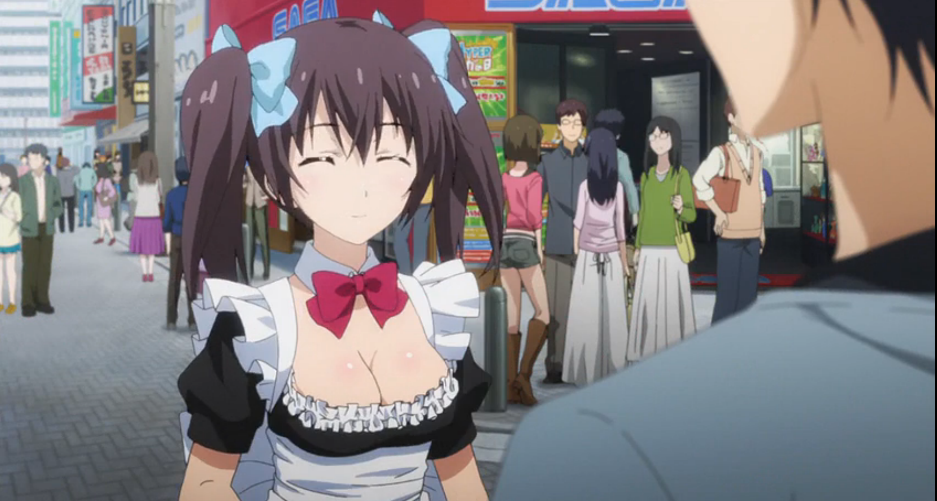 Description: A woman in a dress standing in front of a crowd of people on a street with a man looking at her.