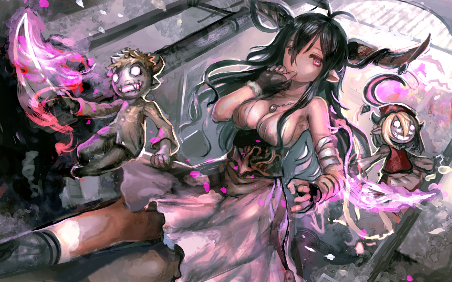 Description: A woman in a dress with a demon on her back and a demon on her arm.