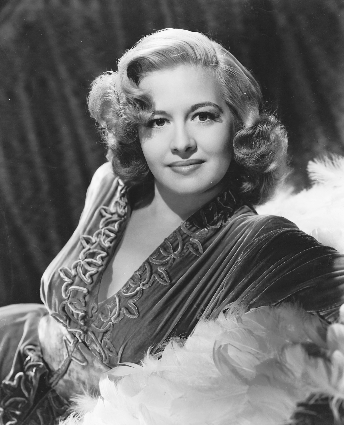 Description: A woman in a dress with feathers on her shoulders and a smile on her face.