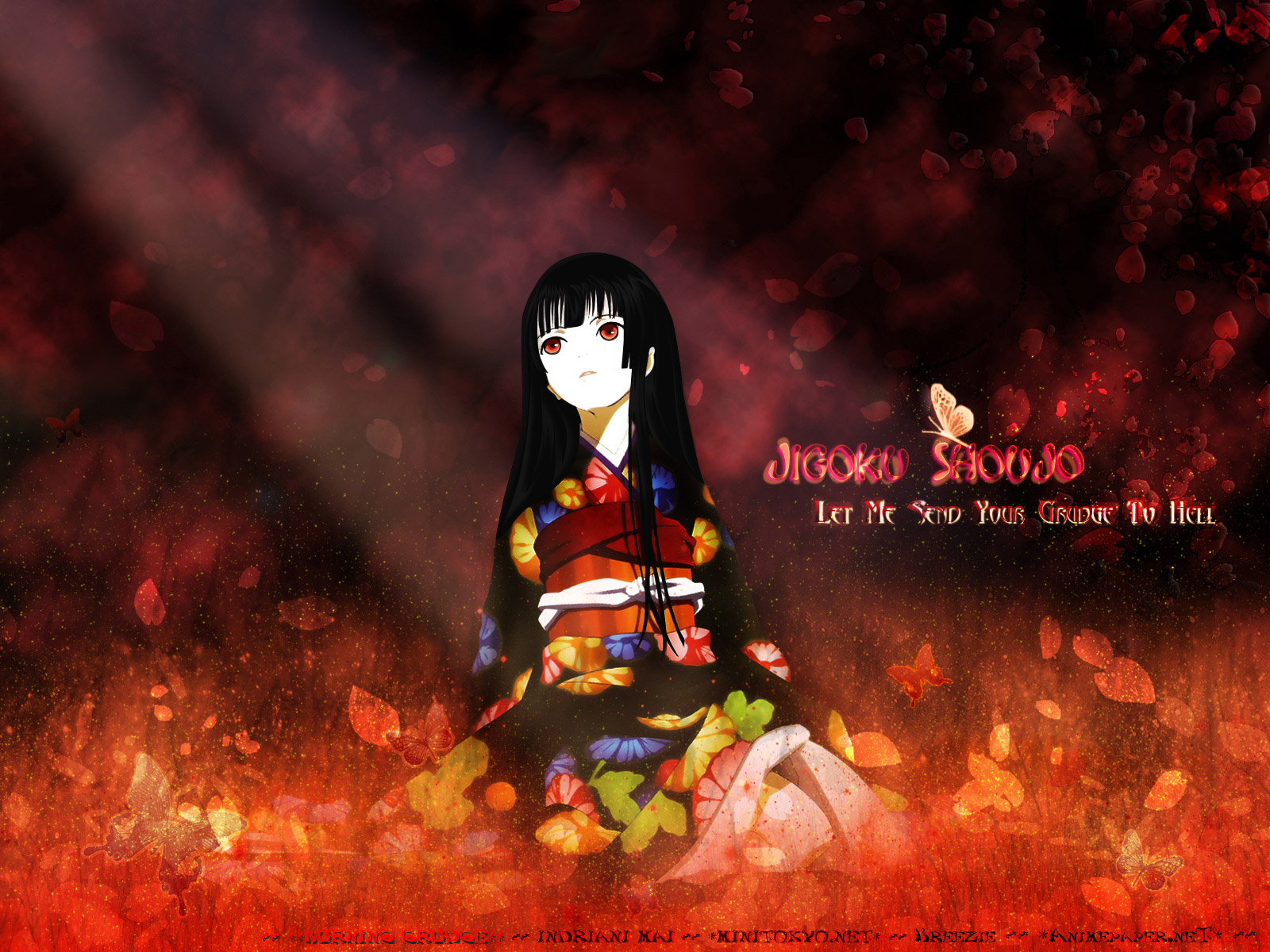 Description: A woman in a dress sitting on a floor with a butterfly flying above her head and a red background.