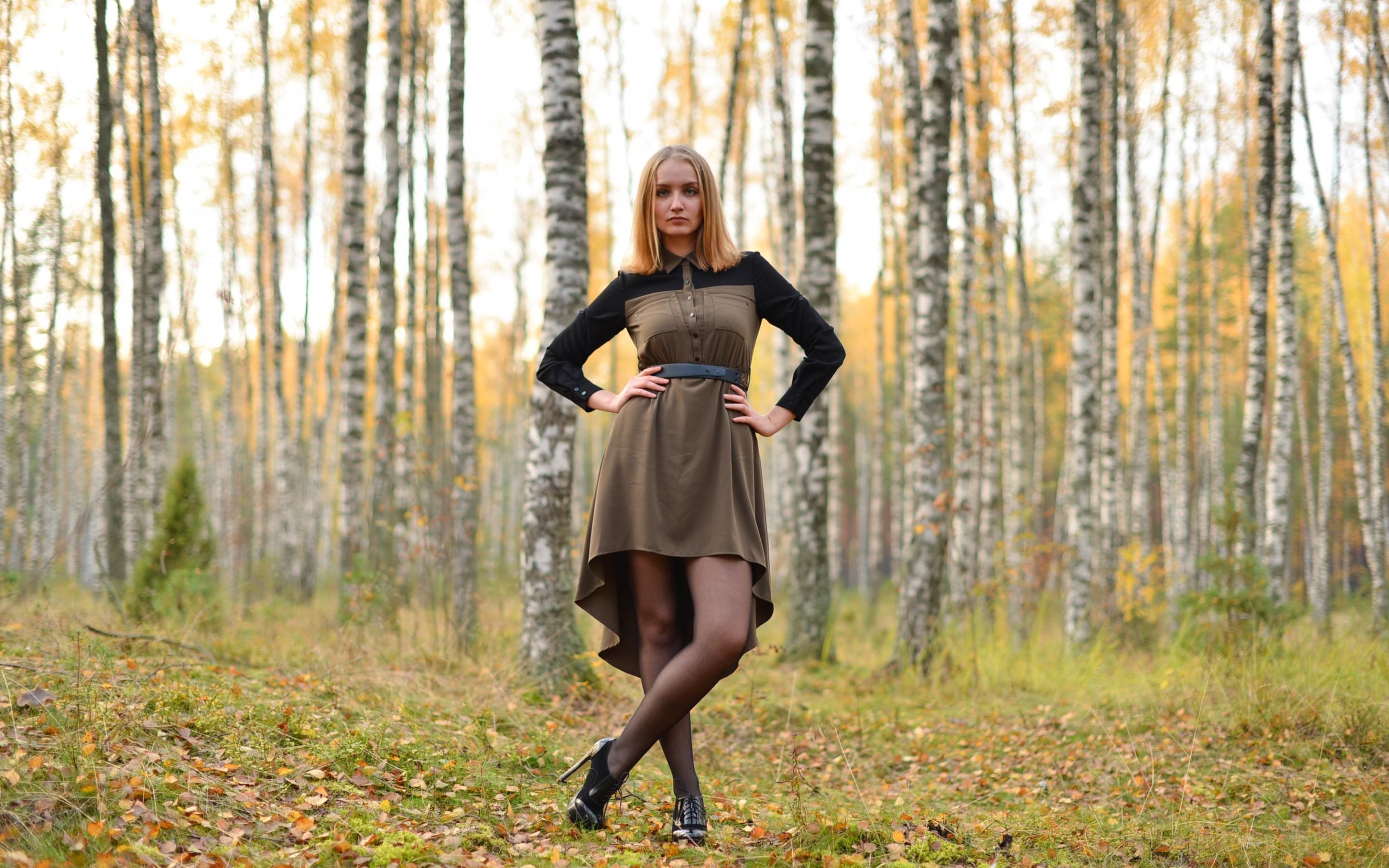 Description: A woman in a brown dress is standing in a forest with her hands on her hips and her legs crossed.