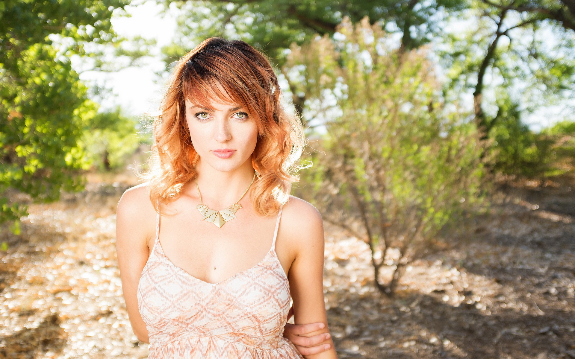 Description: A woman in a dress standing in a forest with trees in the background and bushes in the foreground.