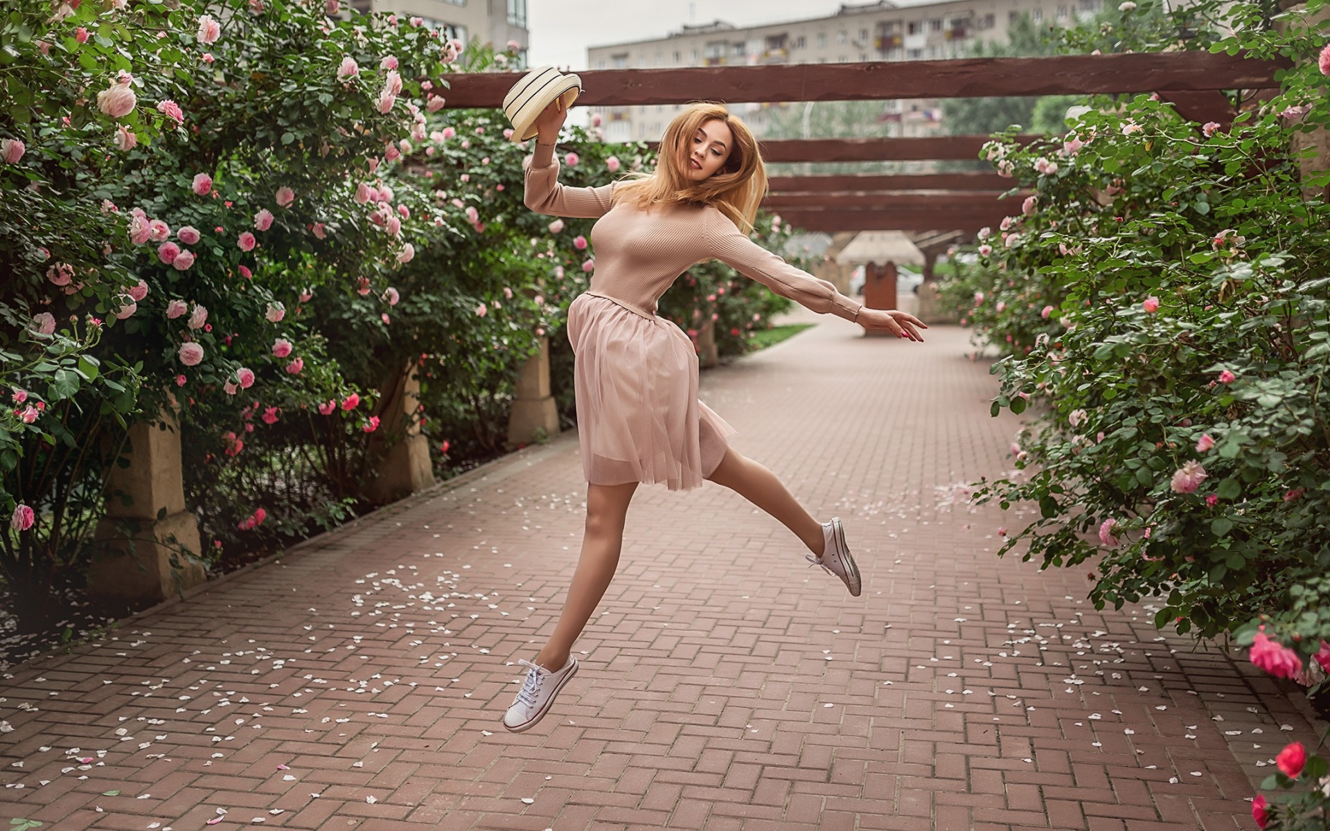 Description: A woman in a dress is jumping in the air with a hat on her head and a hat on her head.