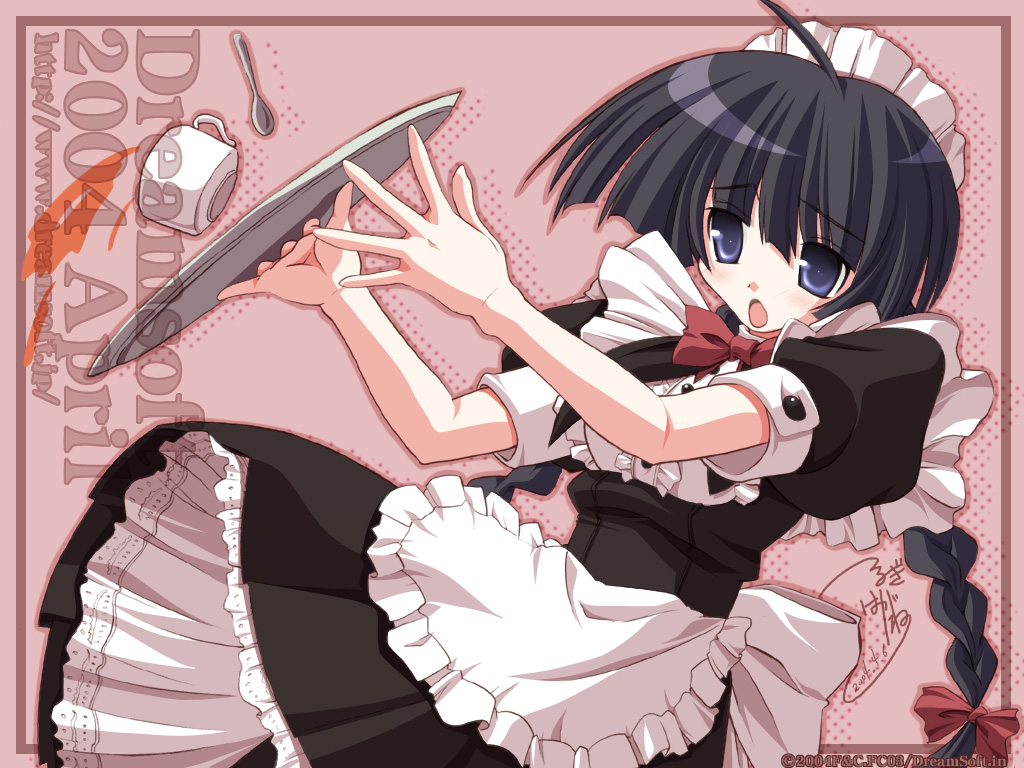 Description: A woman in a dress holding a knife and a plate with a knife in it's hand and a pink background.