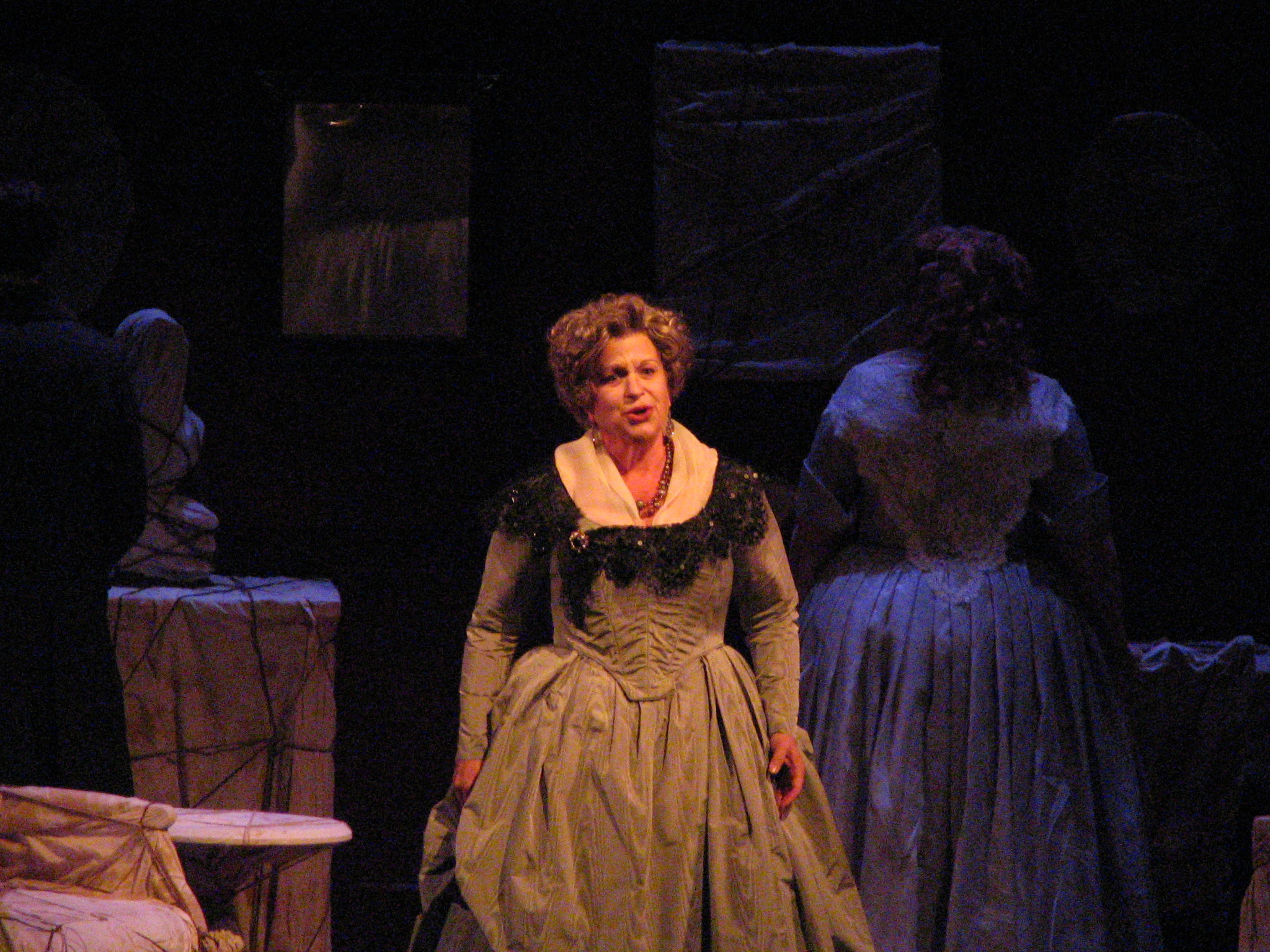 Description: A woman in a dress standing next to a man in a chair and another woman in a dress standing behind her.