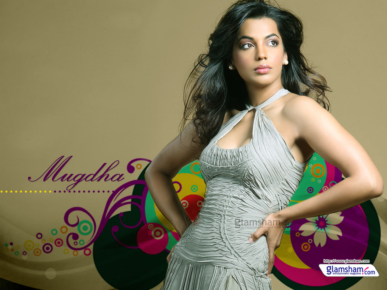Description: A woman in a dress posing for a picture with a colorful background behind her and a name tag on the wall.