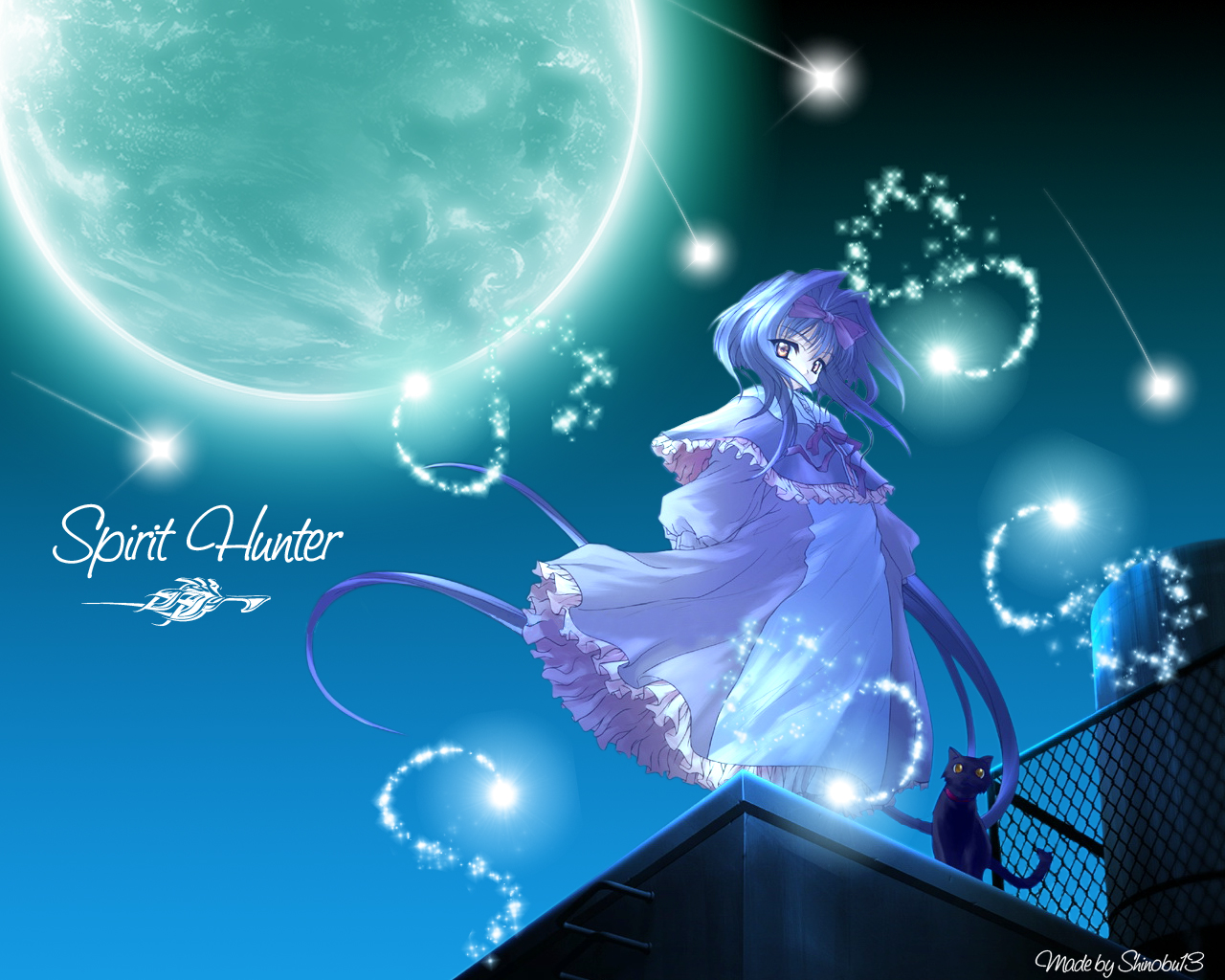 Description: A woman in a dress standing on a roof with a full moon in the background and a blue sky.