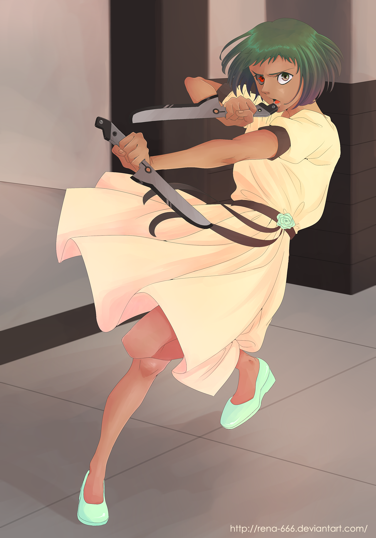 Description: A woman in a dress holding a pair of scissors in her hand and a green hair and green shoes.