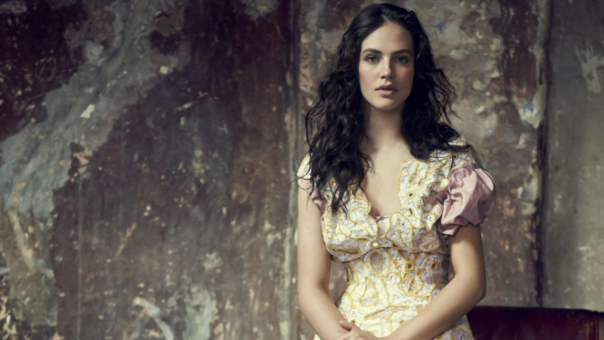 Description: A woman in a dress standing in front of a wall with a suitcase in her hand and a suitcase behind her.