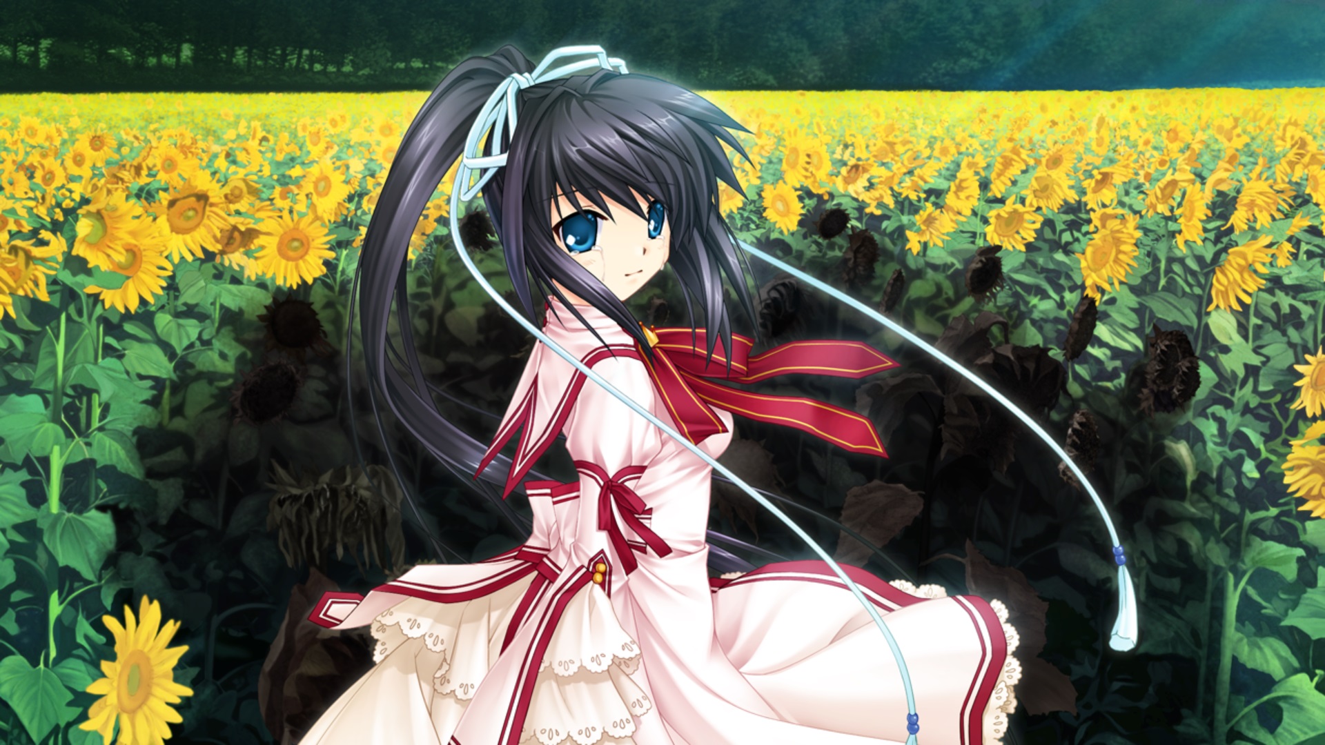 Description: A woman in a dress standing in a field of sunflowers with a long black hair and a red ribbon.