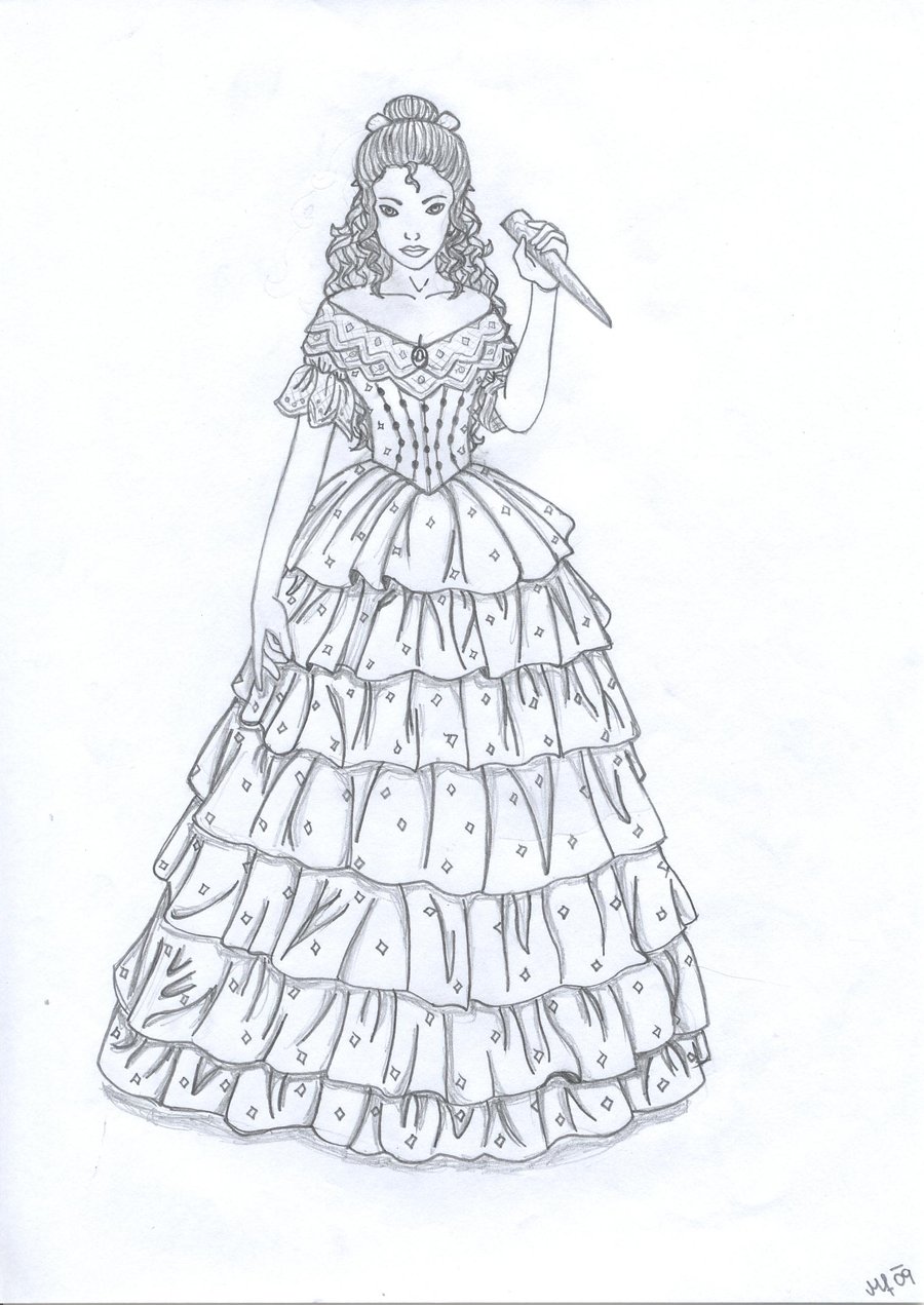 Description: A drawing of a woman in a dress with a sword in her hand and a hat on her head.