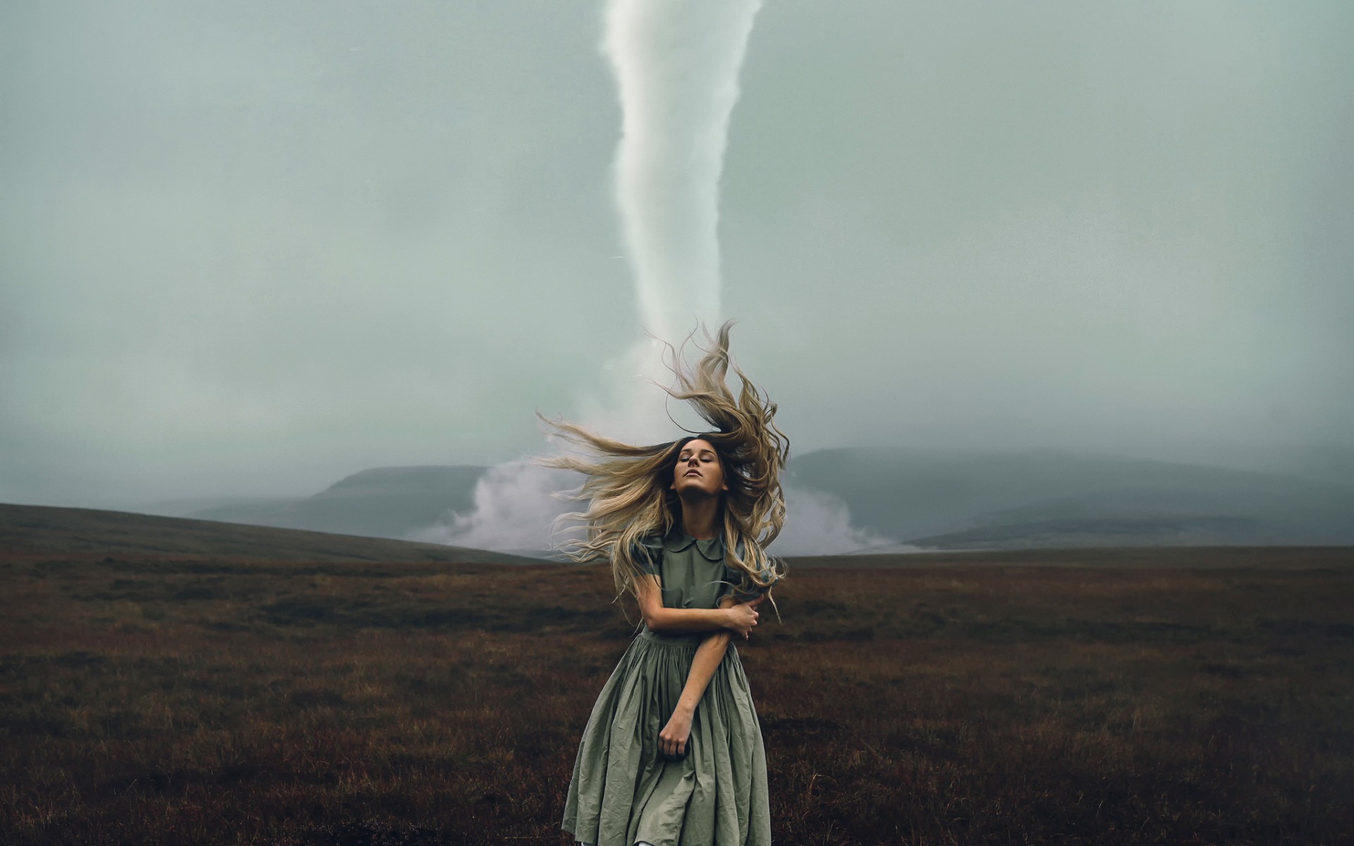 Description: A woman in a dress is standing in a field with a tornado behind her and a cloud in the sky.