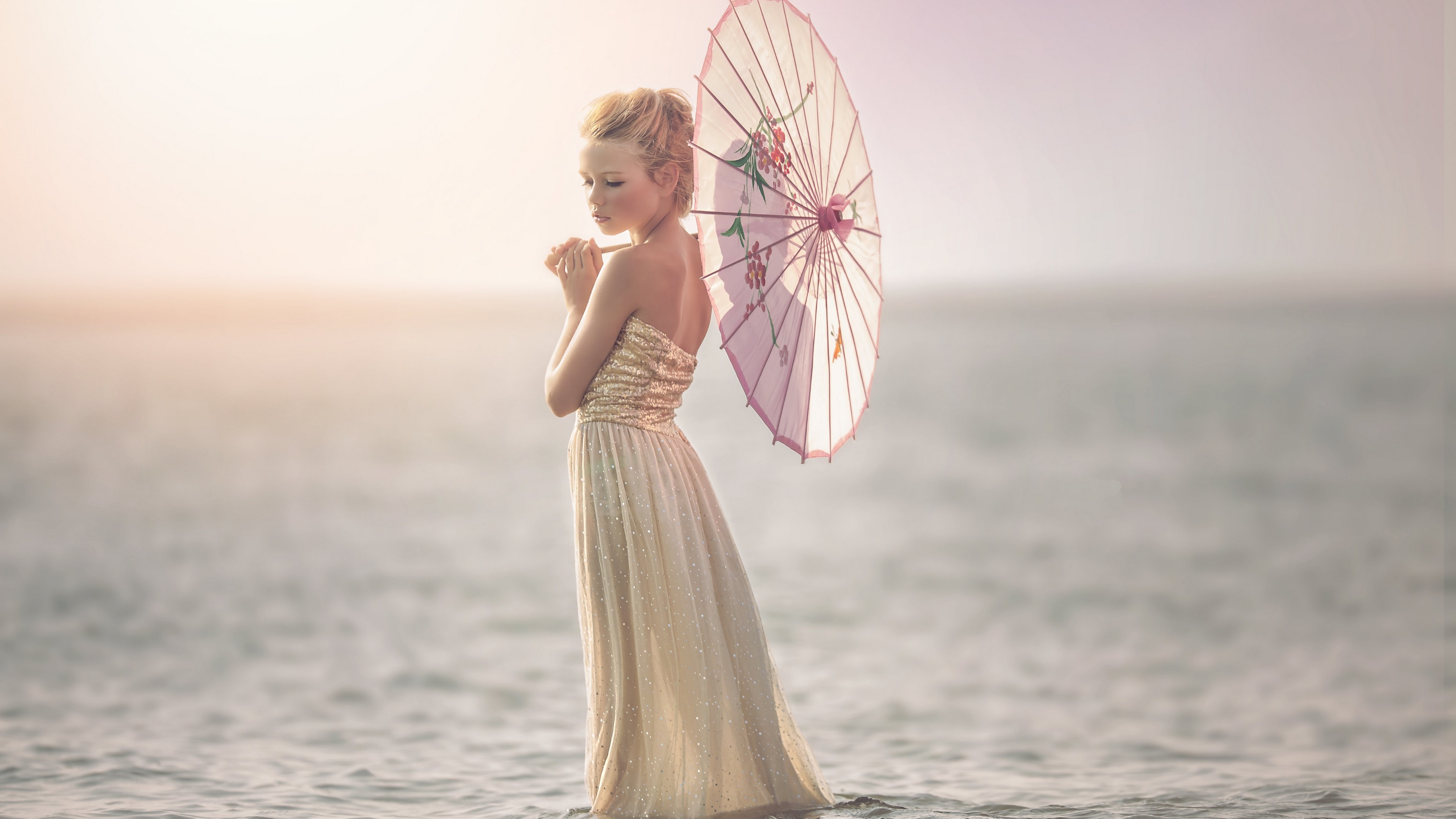 Description: A woman in a dress holding an umbrella in the water at sunset or sunrise or sunset.