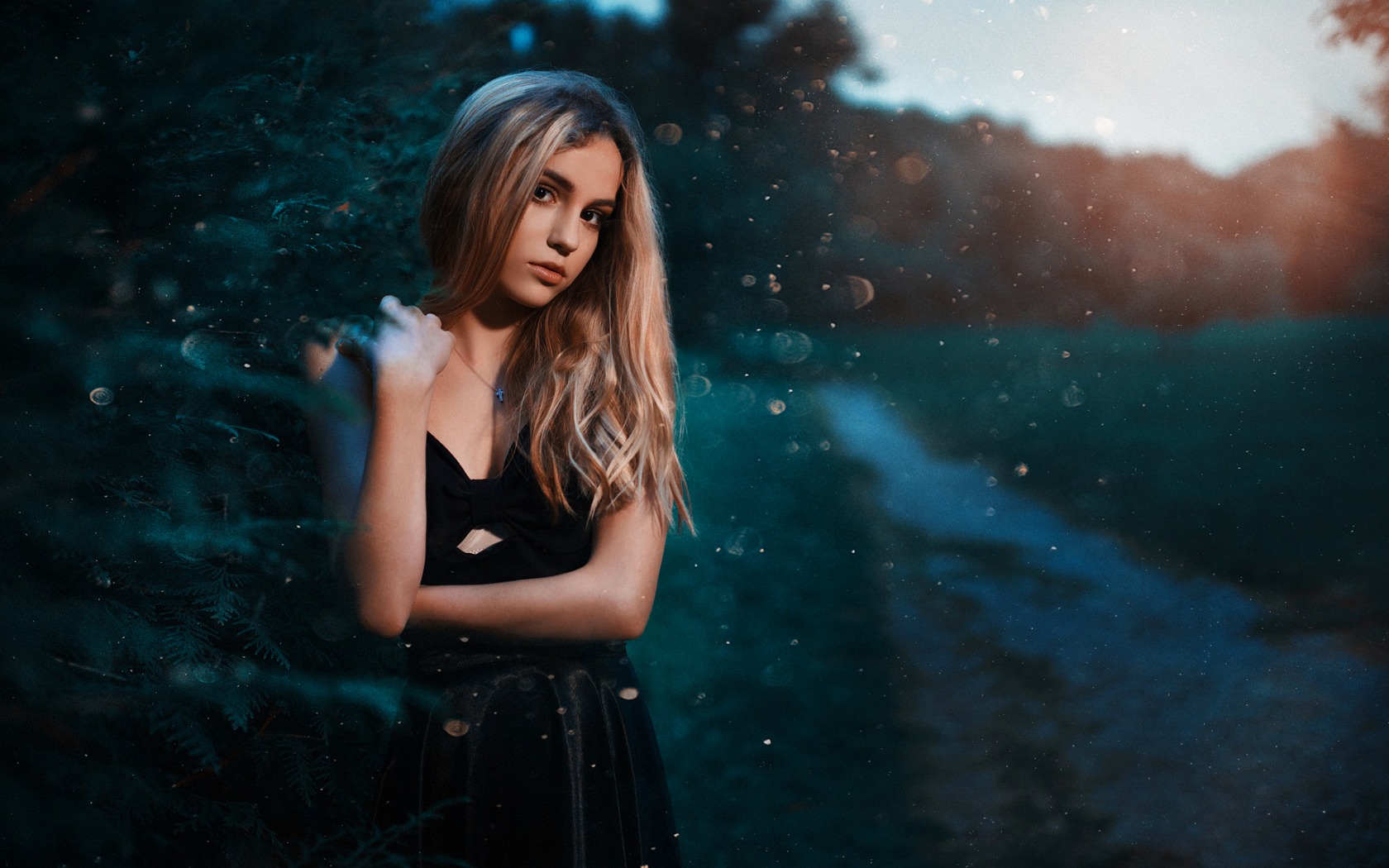 Description: A woman in a black dress is posing for a picture in the woods with her arms crossed and her head tilted.