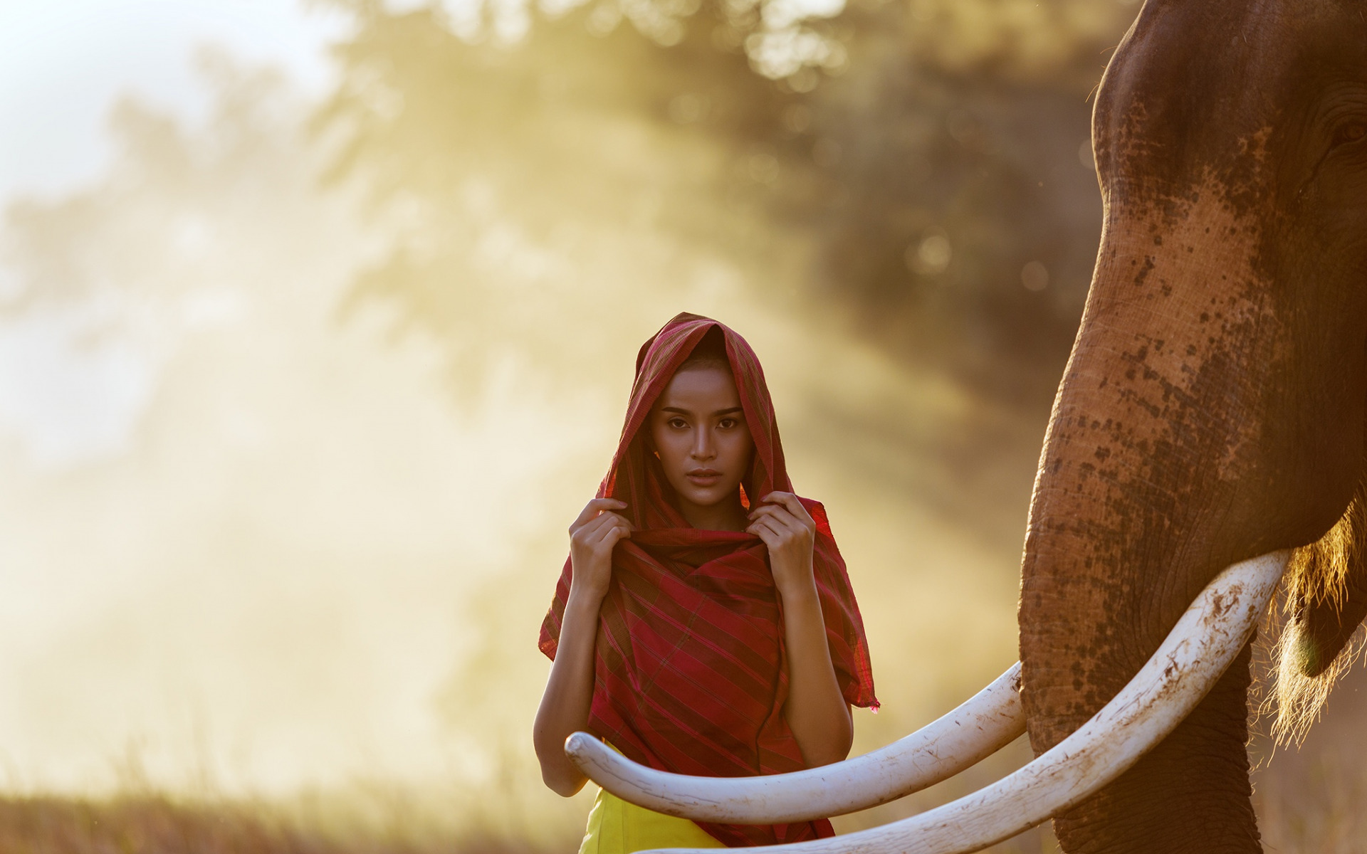Description: A woman in a red shawl is standing next to an elephant with large white tusks and a red scarf.