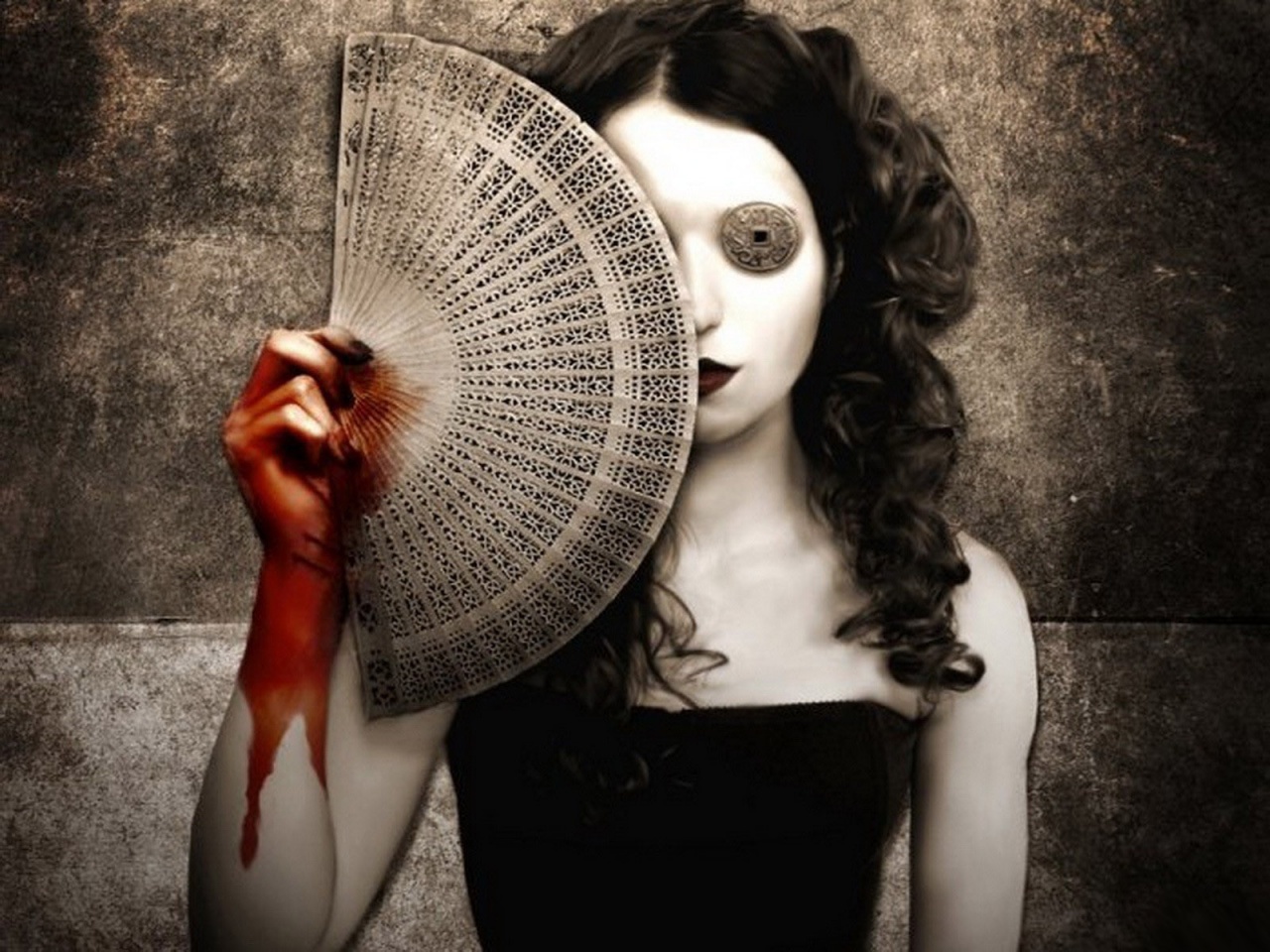 Description: A woman holding a fan with blood dripping from it's face and a bloody hand in her other hand.