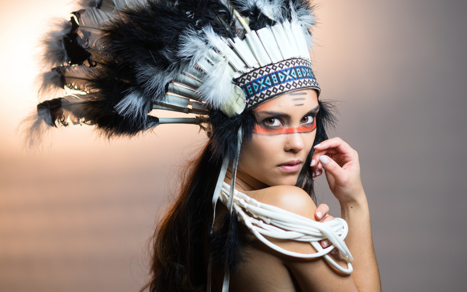 Description: A woman with a feather headdress on talking on a cell phone while wearing a feather headdress.